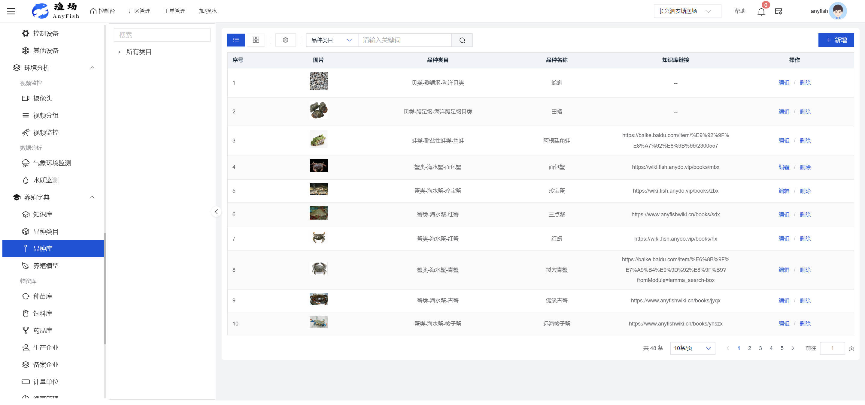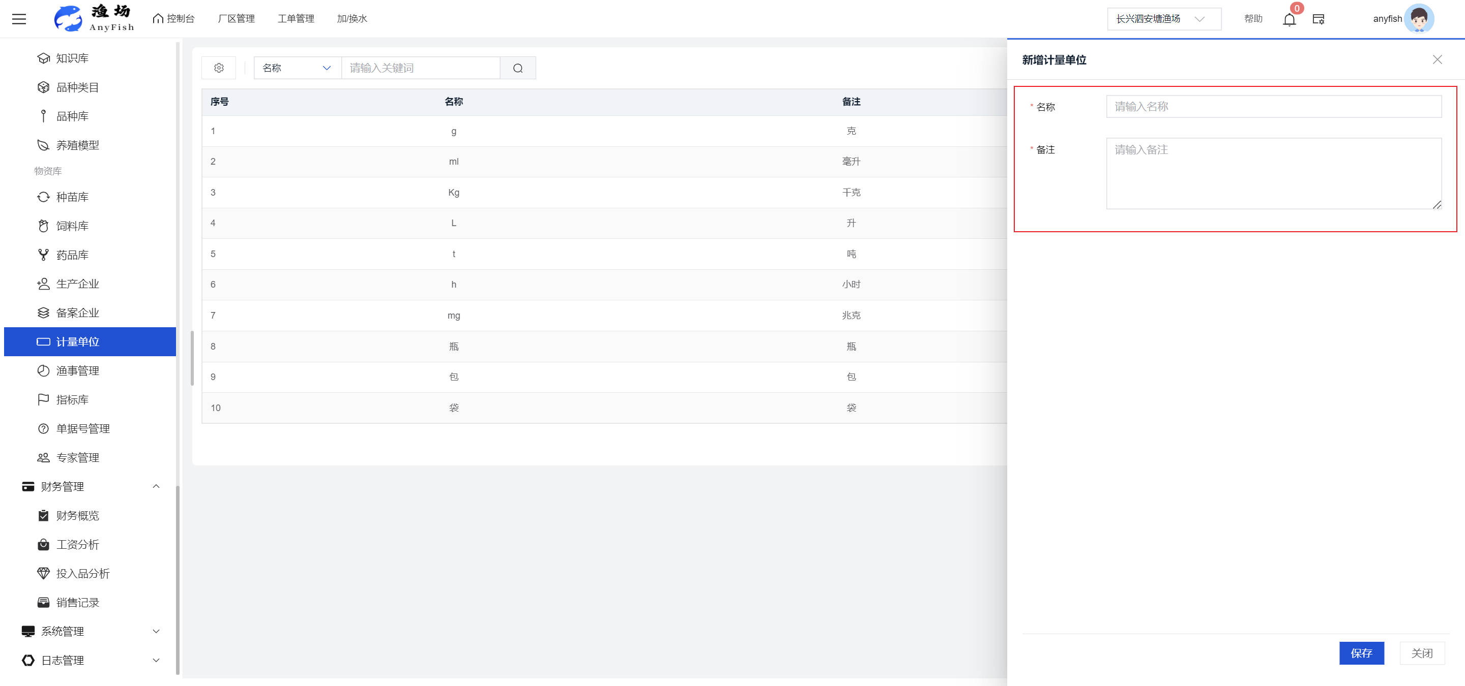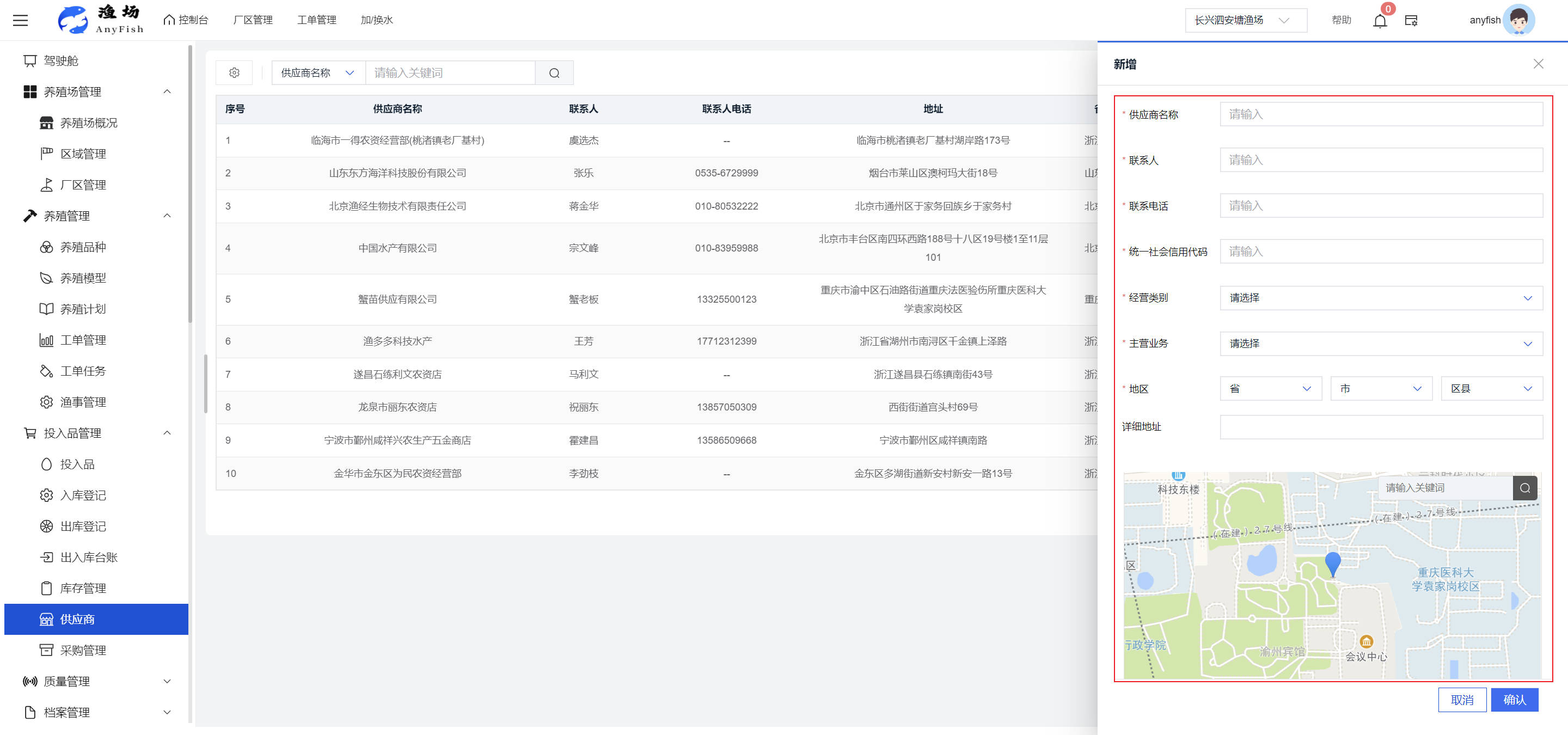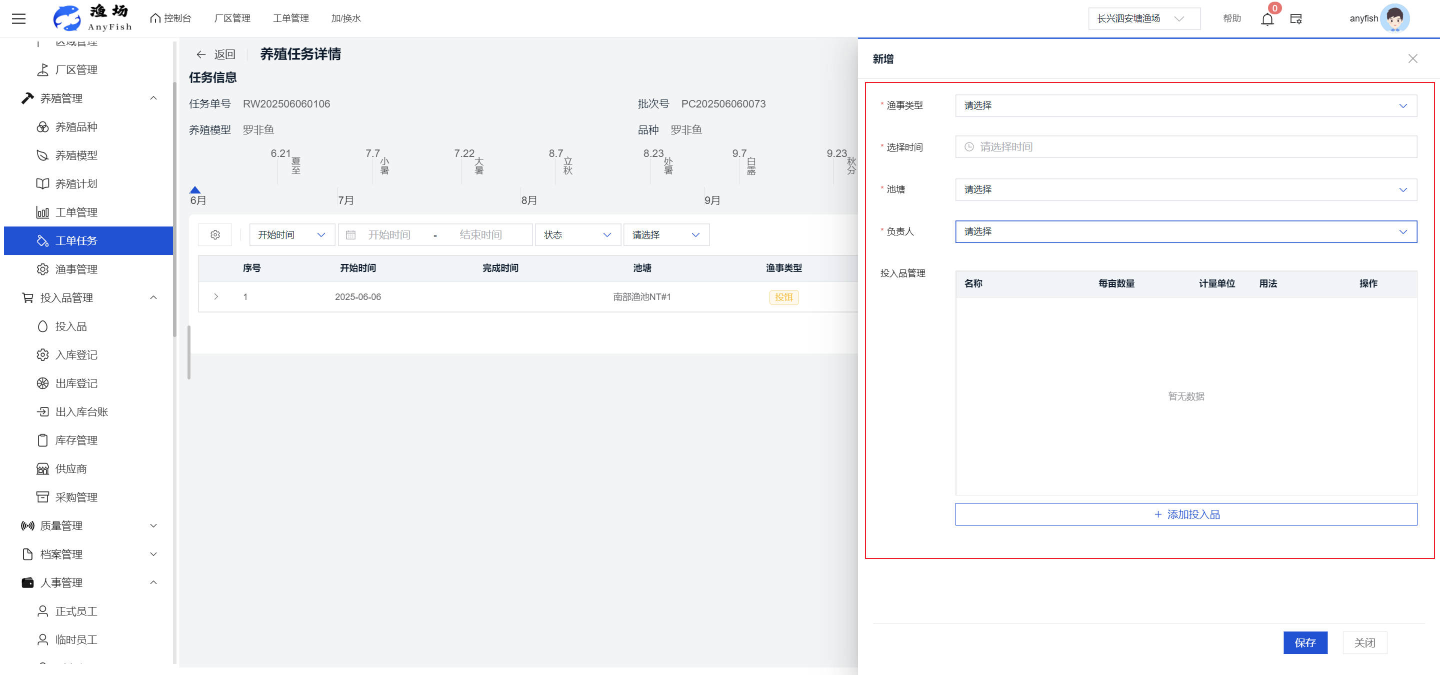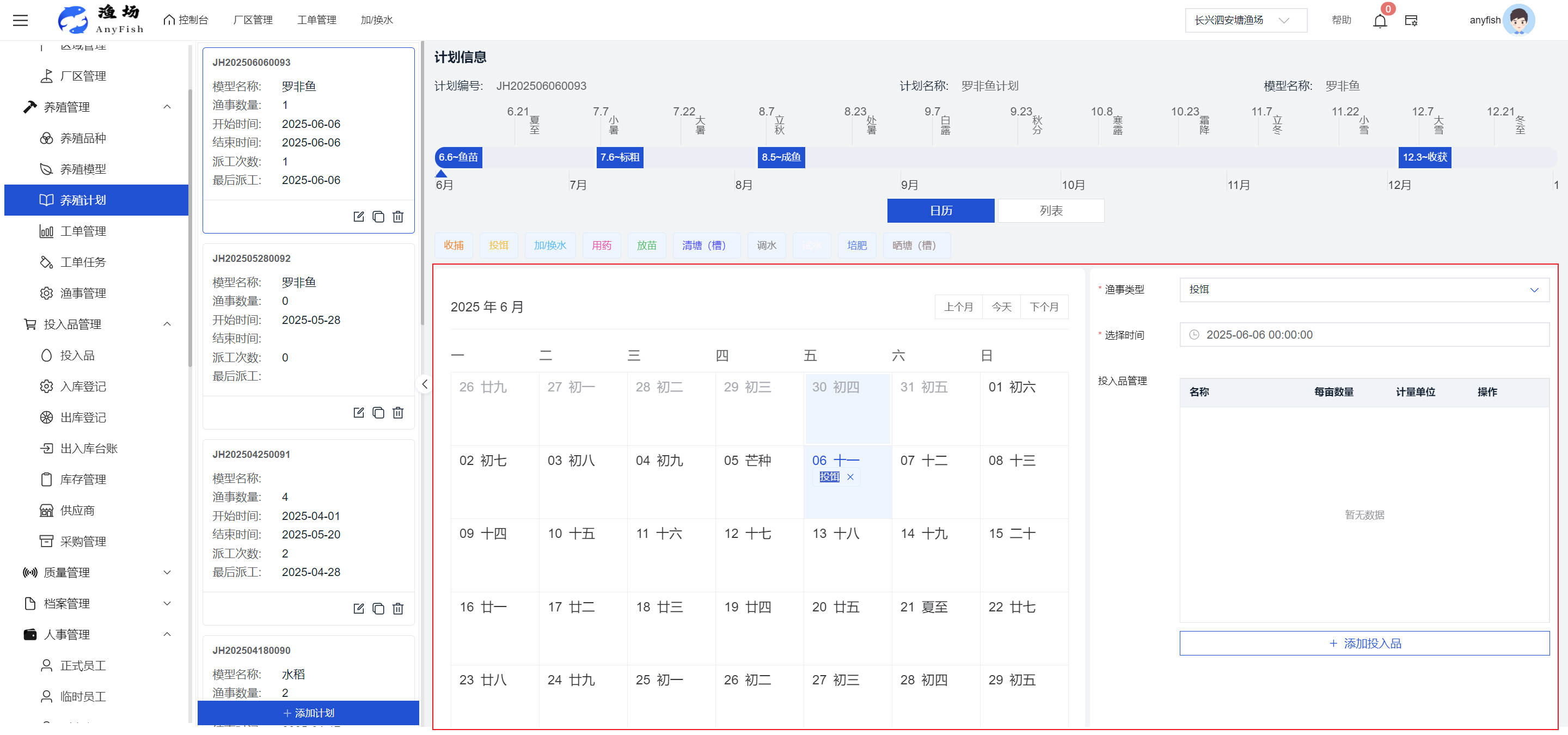 一、操作指南 1.1渔场概况 界面功能概述: 该界面作为渔场的首页及控制台界面,为用户呈现了渔场的整体概况信息。在这里,用户能够清晰地查看到渔场的数量、各个厂区的数量、当前在职的员工人数、实时的天气状况、已安装的摄像头设备数量以及是否存在离线设备等重要信息。同时,该界面还为用户提供了便捷的操作入口,例如可以进行渔场的管理操作以及新增员工等常用功能,方便用户对渔场的基本信息进行快速的了解和管理。  4.1.1.1 渔场概况 界面功能概述: 用户可以点击标红的地方跳转到渔场管理跳转到渔场管理界面。  用户点击界面中标红的区域即可跳转到渔场管理界面。在该界面中,用户可以全面了解渔场的各项详细信息,如渔场的占地面积、具体的养殖区域划分、在职员工的数量及基本信息、各类设备的运行情况、今日和明日的农事安排等。这些信息的展示有助于用户对渔场的整体运营状况有一个清晰的认识,同时也为后续的管理决策提供了有力的数据支持。此外,用户还可以在该界面进行一些基础的管理操作,如编辑渔场的基本信息、调整设备的设置等,以确保渔场的各项工作能够顺利进行。  4.1.1.2 渔场渔事 界面功能概述: 用户可以通过点击界面中标红的区域进入不同的渔事管理模块,例如培肥、投饵、收捕等常见的农事活动。  4.1.1.3 新增用户 界面元素功能概述: 该界面主要用于用户进行新增用户以及添加用户权限的操作。在渔场的日常运营中,可能需要不断添加新的员工或管理人员,并为他们分配相应的权限,以便他们能够顺利地完成各自的工作任务。通过该界面,用户可以方便地完成这些操作,确保渔场的人力资源管理更加高效和有序。  左侧搜索栏 :此搜索栏为用户提供了一个便捷的方式,允许用户在输入框内输入关键字,例如部门名称的关键词,从而快速搜索到特定的部门。这对于拥有多个部门的大型渔场来说,能够大大提高用户查找部门的效率,节省时间。 顶部搜索栏:在这里,用户可以在输入框内填写用户名称或关键词,以便快速搜索到特定的用户。当渔场员工数量较多时,通过关键词搜索能够迅速定位到目标用户,进而对其信息进行相应的操作,如查看、编辑或删除等。  新增用户按钮:点击该按钮后,系统会弹出一个新增用户的表单界面。  用户需要在该表单中填写完整的信息,包括但不限于用户名、密码、姓名、联系方式、所属部门、角色权限等。填写完成后,点击保存按钮,即可将新的用户成功添加到系统当中,使其能够登录并使用系统进行相关的工作操作。  编辑用户按钮:当用户需要修改员工的信息时,可以点击该按钮。  系统会跳转到员工信息编辑界面,在这里,用户可以对员工的基本信息、联系方式、角色权限等进行修改。修改完成后,点击保存按钮,即可使修改后的信息生效,确保员工的信息始终保持准确和更新。  删除按钮:如果需要删除某个员工账号,用户可以点击该删除按钮。系统会弹出一个确认对话框,提示用户是否确定要删除该员工。如果用户点击“是”,则系统将彻底删除该员工账号及其相关信息;如果用户点击“否”,则取消删除操作,员工账号保持不变。在删除员工账号时,用户需要谨慎操作,以免误删重要信息。  修改密码按钮:为了保障系统的安全性,用户可以通过点击该按钮来修改员工的密码。  在修改密码的界面中,用户需要输入新的密码并确认,然后点击保存按钮,即可完成密码的修改。修改后的密码将立即生效,员工需要使用新密码进行登录。这一功能在员工忘记密码或需要定期更新密码的情况下非常实用。  4.1.1.4 告警信息 界面功能概述: 该界面是一个渔场概况列表,主要展示渔场的基本情况以及各类告警信息。用户可以通过该界面查看渔场的详细信息,如渔场名称、位置、占地面积、当前的渔事活动等。  同时,系统会将各类告警信息以醒目的方式展示出来,包括设备故障告警、环境异常告警(如温度过高、湿度过低等)、渔事任务超时告警等。用户可以点击相应的告警信息,查看更多详细的告警内容,如告警发生的时间、具体的设备或区域、告警的严重程度等。此外,用户还可以在该界面进行一些相关的操作,如确认告警信息、查看告警处理进度、设置告警提醒方式等,以便及时处理各类问题,确保渔场的正常运营。  4.2渔场管理 4.2.1.渔场管理 摄像头管理 :用户可以在该界面中对摄像头进行添加、删除、调整位置等操作。通过合理配置摄像头,用户可以实现对渔场各个区域的实时监控,便于及时发现异常情况,保障渔场的安全。  4.2.2 厂区管理 界面功能概述 该界面是一个池塘列表,主要用于查看池塘的详细信息,包括池塘的占地面积、养殖模型、养殖面积、生长周期等。用户可以通过该界面全面了解各个池塘的基本情况,为养殖规划和渔事安排提供重要依据。同时,该界面还为用户提供了多种操作功能,如池塘管理操作、查看池塘详细信息等,方便用户对地块进行有效的管理和维护。  4.2.2.1 池塘管理:  添加旁边的搜索框(与添加按钮分开) :该搜索框允许用户输入关键词,如池塘名称、投入品名称或相关信息,进行快速搜索。通过输入关键词,系统将自动筛选出符合条件的池塘信息,方便用户在众多地块中快速找到目标池塘,提高工作效率。 添加按钮 :用户可以在右侧输入要添加的池塘信息,