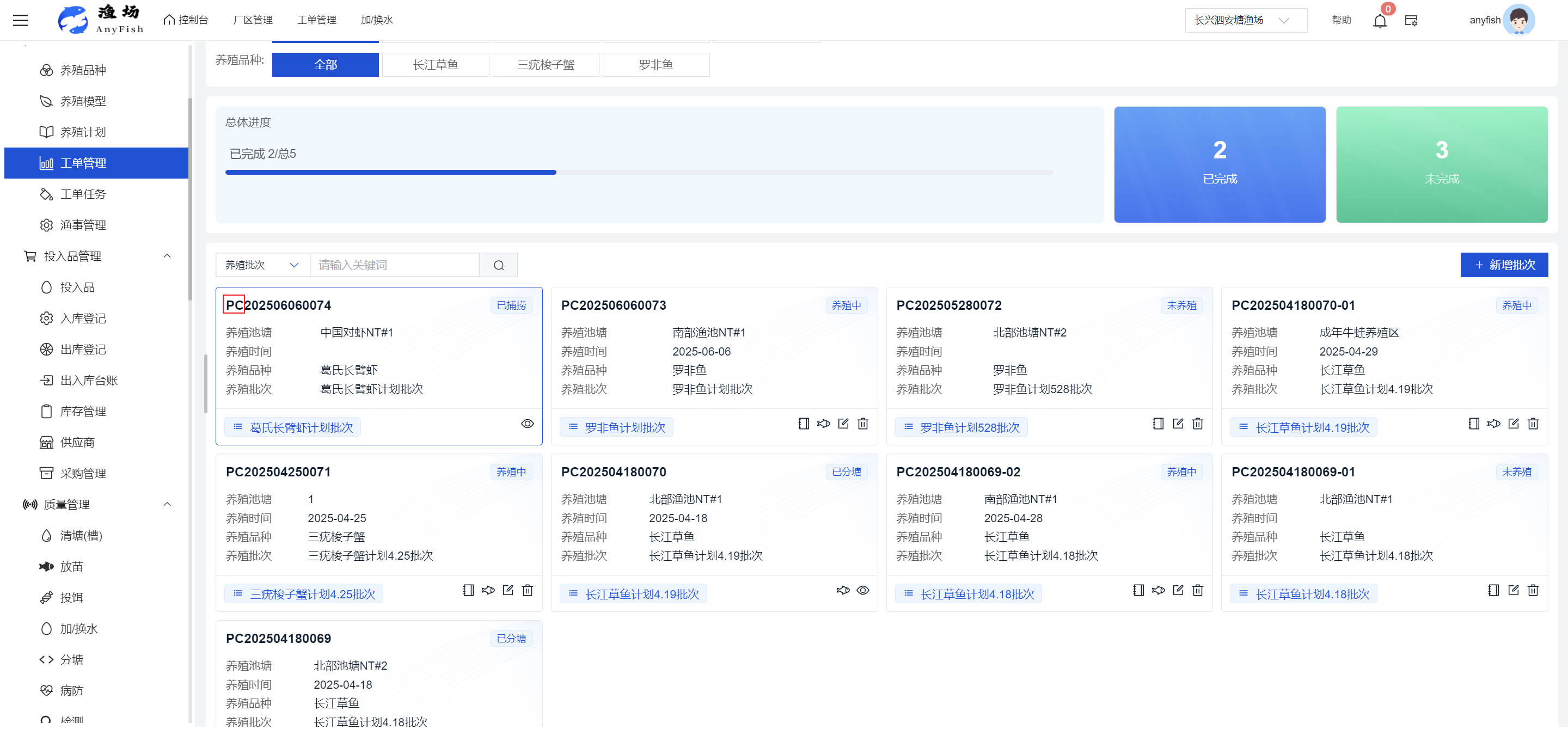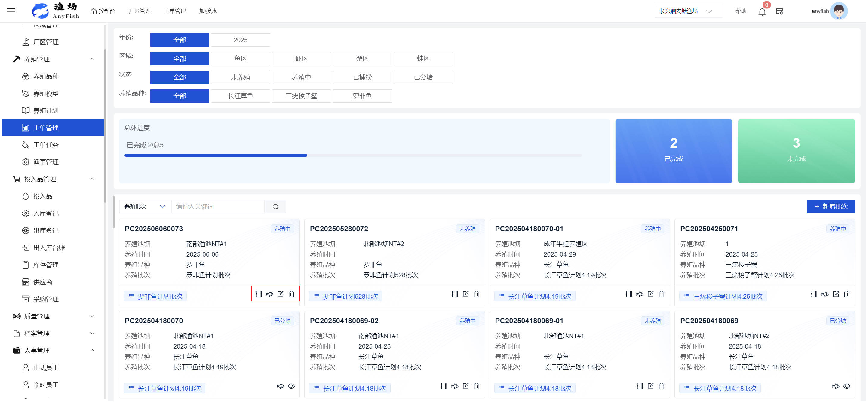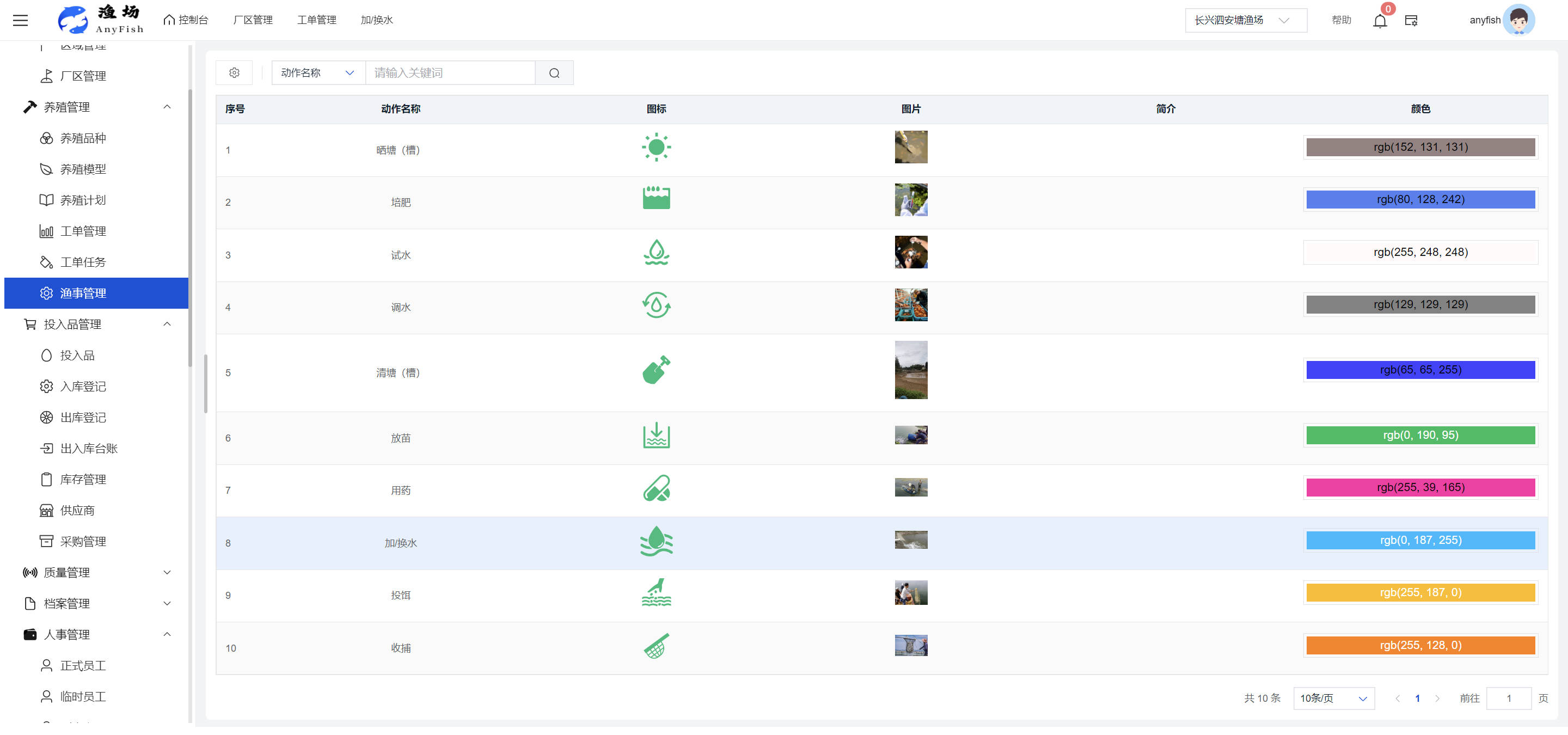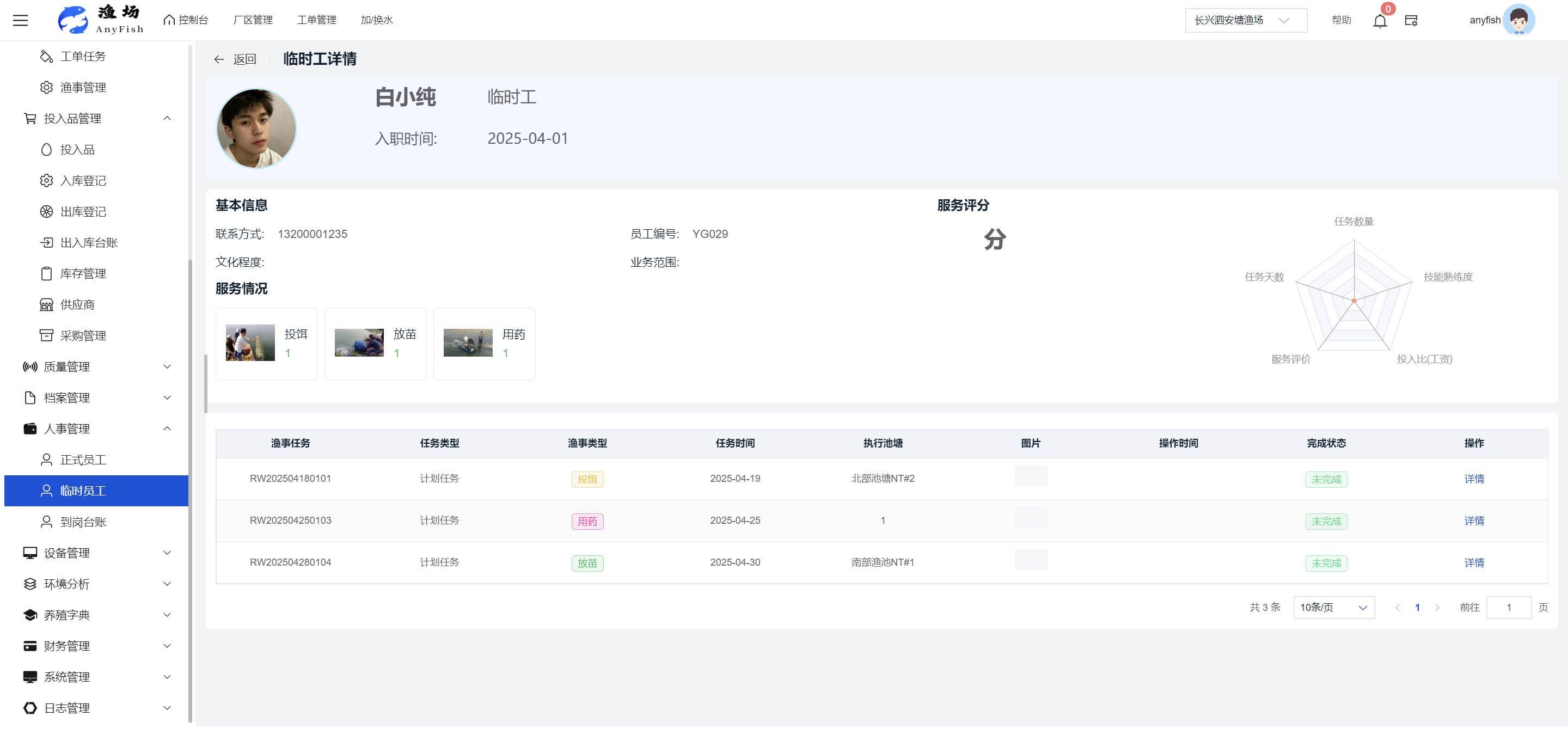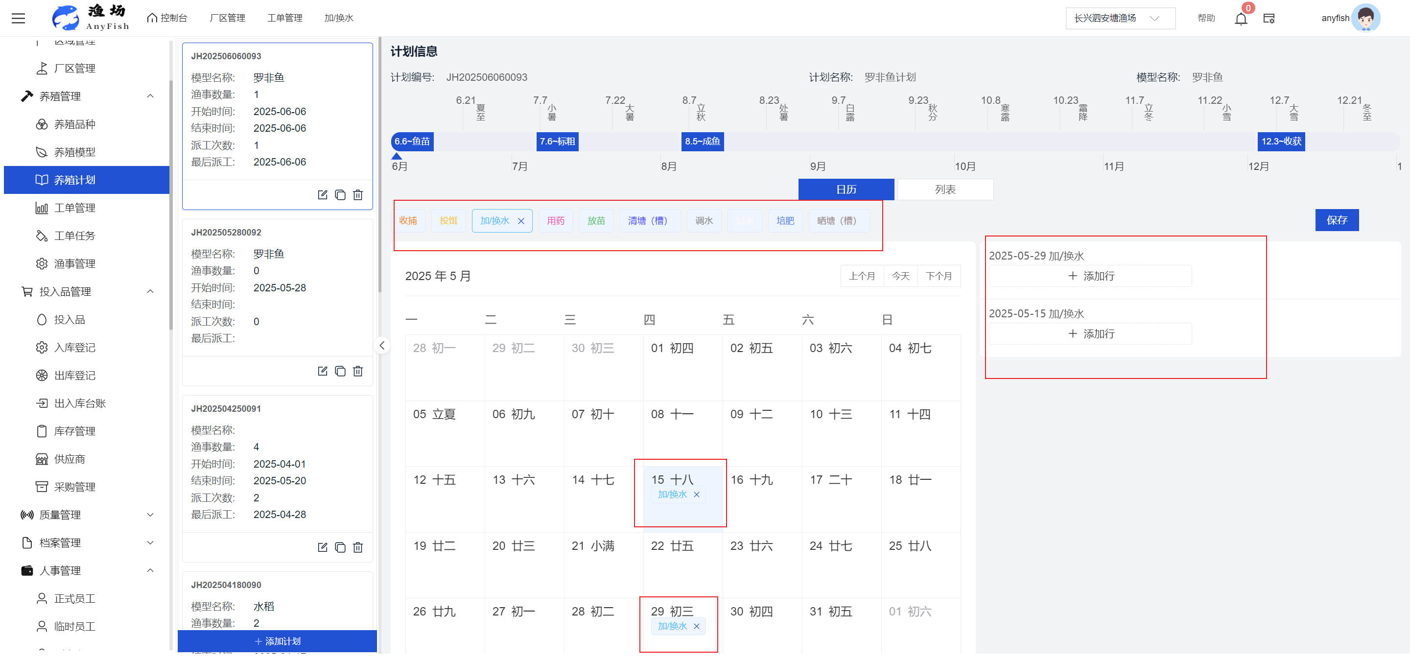 一、操作指南 1.1渔场概况 界面功能概述: 该界面作为渔场的首页及控制台界面,为用户呈现了渔场的整体概况信息。在这里,用户能够清晰地查看到渔场的数量、各个厂区的数量、当前在职的员工人数、实时的天气状况、已安装的摄像头设备数量以及是否存在离线设备等重要信息。同时,该界面还为用户提供了便捷的操作入口,例如可以进行渔场的管理操作以及新增员工等常用功能,方便用户对渔场的基本信息进行快速的了解和管理。  4.1.1.1 渔场概况 界面功能概述: 用户可以点击标红的地方跳转到渔场管理跳转到渔场管理界面。  用户点击界面中标红的区域即可跳转到渔场管理界面。在该界面中,用户可以全面了解渔场的各项详细信息,如渔场的占地面积、具体的养殖区域划分、在职员工的数量及基本信息、各类设备的运行情况、今日和明日的农事安排等。这些信息的展示有助于用户对渔场的整体运营状况有一个清晰的认识,同时也为后续的管理决策提供了有力的数据支持。此外,用户还可以在该界面进行一些基础的管理操作,如编辑渔场的基本信息、调整设备的设置等,以确保渔场的各项工作能够顺利进行。  4.1.1.2 渔场渔事 界面功能概述: 用户可以通过点击界面中标红的区域进入不同的渔事管理模块,例如培肥、投饵、收捕等常见的农事活动。  4.1.1.3 新增用户 界面元素功能概述: 该界面主要用于用户进行新增用户以及添加用户权限的操作。在渔场的日常运营中,可能需要不断添加新的员工或管理人员,并为他们分配相应的权限,以便他们能够顺利地完成各自的工作任务。通过该界面,用户可以方便地完成这些操作,确保渔场的人力资源管理更加高效和有序。  左侧搜索栏 :此搜索栏为用户提供了一个便捷的方式,允许用户在输入框内输入关键字,例如部门名称的关键词,从而快速搜索到特定的部门。这对于拥有多个部门的大型渔场来说,能够大大提高用户查找部门的效率,节省时间。 顶部搜索栏:在这里,用户可以在输入框内填写用户名称或关键词,以便快速搜索到特定的用户。当渔场员工数量较多时,通过关键词搜索能够迅速定位到目标用户,进而对其信息进行相应的操作,如查看、编辑或删除等。  新增用户按钮:点击该按钮后,系统会弹出一个新增用户的表单界面。  用户需要在该表单中填写完整的信息,包括但不限于用户名、密码、姓名、联系方式、所属部门、角色权限等。填写完成后,点击保存按钮,即可将新的用户成功添加到系统当中,使其能够登录并使用系统进行相关的工作操作。  编辑用户按钮:当用户需要修改员工的信息时,可以点击该按钮。  系统会跳转到员工信息编辑界面,在这里,用户可以对员工的基本信息、联系方式、角色权限等进行修改。修改完成后,点击保存按钮,即可使修改后的信息生效,确保员工的信息始终保持准确和更新。  删除按钮:如果需要删除某个员工账号,用户可以点击该删除按钮。系统会弹出一个确认对话框,提示用户是否确定要删除该员工。如果用户点击“是”,则系统将彻底删除该员工账号及其相关信息;如果用户点击“否”,则取消删除操作,员工账号保持不变。在删除员工账号时,用户需要谨慎操作,以免误删重要信息。  修改密码按钮:为了保障系统的安全性,用户可以通过点击该按钮来修改员工的密码。  在修改密码的界面中,用户需要输入新的密码并确认,然后点击保存按钮,即可完成密码的修改。修改后的密码将立即生效,员工需要使用新密码进行登录。这一功能在员工忘记密码或需要定期更新密码的情况下非常实用。  4.1.1.4 告警信息 界面功能概述: 该界面是一个渔场概况列表,主要展示渔场的基本情况以及各类告警信息。用户可以通过该界面查看渔场的详细信息,如渔场名称、位置、占地面积、当前的渔事活动等。  同时,系统会将各类告警信息以醒目的方式展示出来,包括设备故障告警、环境异常告警(如温度过高、湿度过低等)、渔事任务超时告警等。用户可以点击相应的告警信息,查看更多详细的告警内容,如告警发生的时间、具体的设备或区域、告警的严重程度等。此外,用户还可以在该界面进行一些相关的操作,如确认告警信息、查看告警处理进度、设置告警提醒方式等,以便及时处理各类问题,确保渔场的正常运营。  4.2渔场管理 4.2.1.渔场管理 摄像头管理 :用户可以在该界面中对摄像头进行添加、删除、调整位置等操作。通过合理配置摄像头,用户可以实现对渔场各个区域的实时监控,便于及时发现异常情况,保障渔场的安全。  4.2.2 厂区管理 界面功能概述 该界面是一个池塘列表,主要用于查看池塘的详细信息,包括池塘的占地面积、养殖模型、养殖面积、生长周期等。用户可以通过该界面全面了解各个池塘的基本情况,为养殖规划和渔事安排提供重要依据。同时,该界面还为用户提供了多种操作功能,如池塘管理操作、查看池塘详细信息等,方便用户对地块进行有效的管理和维护。  4.2.2.1 池塘管理:  添加旁边的搜索框(与添加按钮分开) :该搜索框允许用户输入关键词,如池塘名称、投入品名称或相关信息,进行快速搜索。通过输入关键词,系统将自动筛选出符合条件的池塘信息,方便用户在众多地块中快速找到目标池塘,提高工作效率。 添加按钮 :用户可以在右侧输入要添加的池塘信息,
