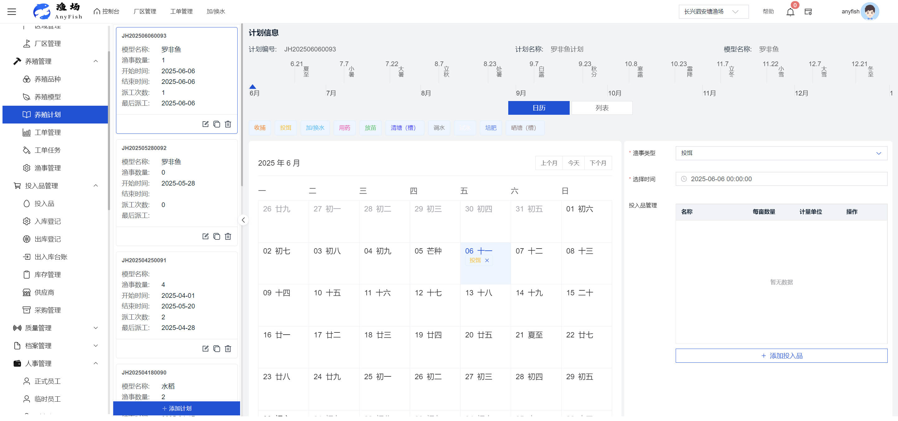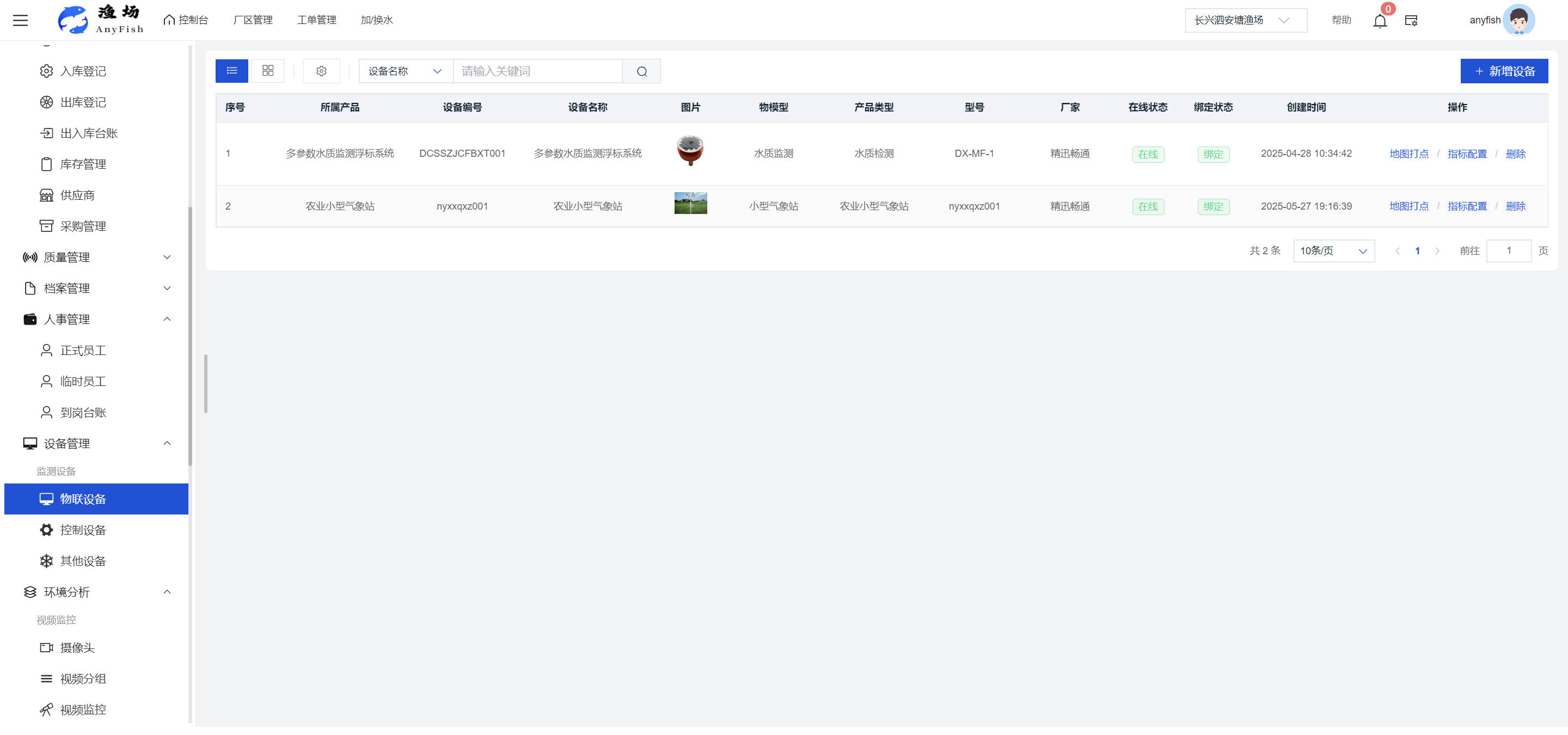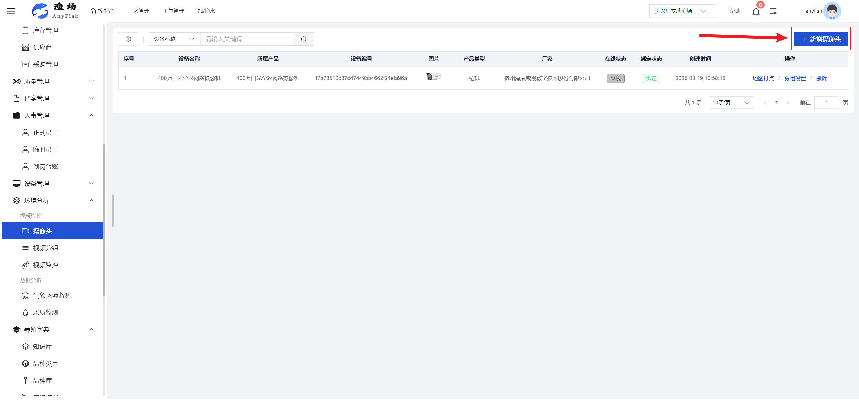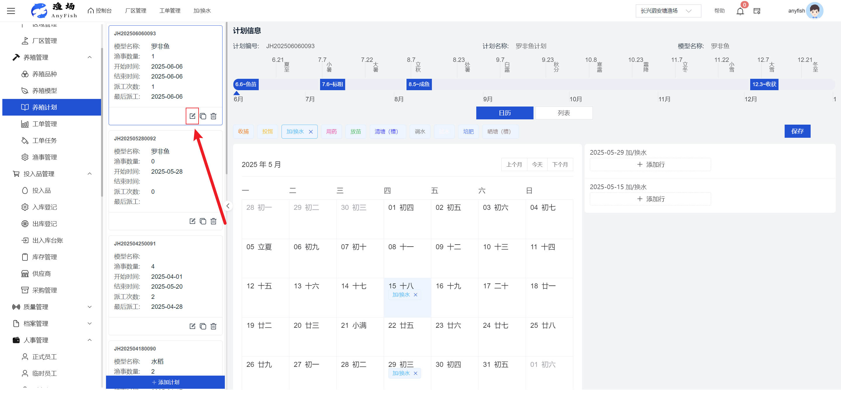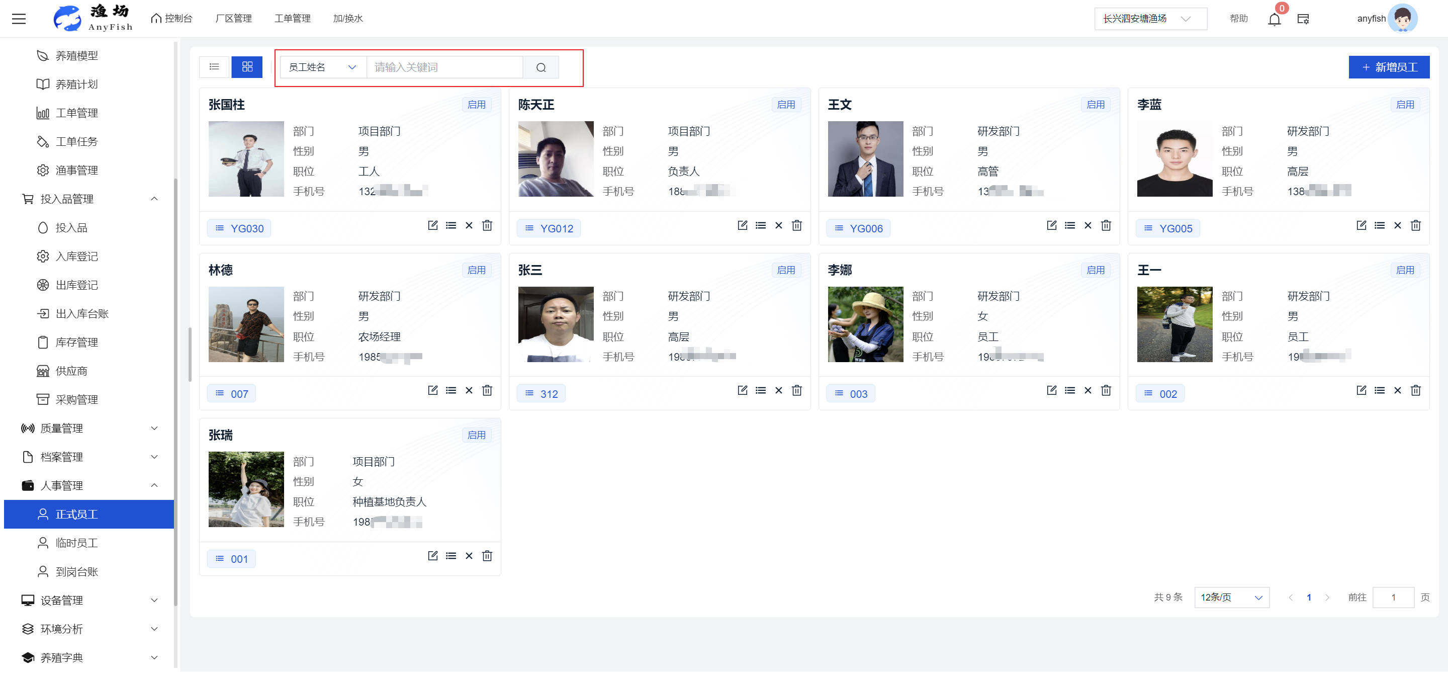 一、操作指南 1.1渔场概况 界面功能概述: 该界面作为渔场的首页及控制台界面,为用户呈现了渔场的整体概况信息。在这里,用户能够清晰地查看到渔场的数量、各个厂区的数量、当前在职的员工人数、实时的天气状况、已安装的摄像头设备数量以及是否存在离线设备等重要信息。同时,该界面还为用户提供了便捷的操作入口,例如可以进行渔场的管理操作以及新增员工等常用功能,方便用户对渔场的基本信息进行快速的了解和管理。  4.1.1.1 渔场概况 界面功能概述: 用户可以点击标红的地方跳转到渔场管理跳转到渔场管理界面。  用户点击界面中标红的区域即可跳转到渔场管理界面。在该界面中,用户可以全面了解渔场的各项详细信息,如渔场的占地面积、具体的养殖区域划分、在职员工的数量及基本信息、各类设备的运行情况、今日和明日的农事安排等。这些信息的展示有助于用户对渔场的整体运营状况有一个清晰的认识,同时也为后续的管理决策提供了有力的数据支持。此外,用户还可以在该界面进行一些基础的管理操作,如编辑渔场的基本信息、调整设备的设置等,以确保渔场的各项工作能够顺利进行。  4.1.1.2 渔场渔事 界面功能概述: 用户可以通过点击界面中标红的区域进入不同的渔事管理模块,例如培肥、投饵、收捕等常见的农事活动。  4.1.1.3 新增用户 界面元素功能概述: 该界面主要用于用户进行新增用户以及添加用户权限的操作。在渔场的日常运营中,可能需要不断添加新的员工或管理人员,并为他们分配相应的权限,以便他们能够顺利地完成各自的工作任务。通过该界面,用户可以方便地完成这些操作,确保渔场的人力资源管理更加高效和有序。  左侧搜索栏 :此搜索栏为用户提供了一个便捷的方式,允许用户在输入框内输入关键字,例如部门名称的关键词,从而快速搜索到特定的部门。这对于拥有多个部门的大型渔场来说,能够大大提高用户查找部门的效率,节省时间。 顶部搜索栏:在这里,用户可以在输入框内填写用户名称或关键词,以便快速搜索到特定的用户。当渔场员工数量较多时,通过关键词搜索能够迅速定位到目标用户,进而对其信息进行相应的操作,如查看、编辑或删除等。  新增用户按钮:点击该按钮后,系统会弹出一个新增用户的表单界面。  用户需要在该表单中填写完整的信息,包括但不限于用户名、密码、姓名、联系方式、所属部门、角色权限等。填写完成后,点击保存按钮,即可将新的用户成功添加到系统当中,使其能够登录并使用系统进行相关的工作操作。  编辑用户按钮:当用户需要修改员工的信息时,可以点击该按钮。  系统会跳转到员工信息编辑界面,在这里,用户可以对员工的基本信息、联系方式、角色权限等进行修改。修改完成后,点击保存按钮,即可使修改后的信息生效,确保员工的信息始终保持准确和更新。  删除按钮:如果需要删除某个员工账号,用户可以点击该删除按钮。系统会弹出一个确认对话框,提示用户是否确定要删除该员工。如果用户点击“是”,则系统将彻底删除该员工账号及其相关信息;如果用户点击“否”,则取消删除操作,员工账号保持不变。在删除员工账号时,用户需要谨慎操作,以免误删重要信息。  修改密码按钮:为了保障系统的安全性,用户可以通过点击该按钮来修改员工的密码。  在修改密码的界面中,用户需要输入新的密码并确认,然后点击保存按钮,即可完成密码的修改。修改后的密码将立即生效,员工需要使用新密码进行登录。这一功能在员工忘记密码或需要定期更新密码的情况下非常实用。  4.1.1.4 告警信息 界面功能概述: 该界面是一个渔场概况列表,主要展示渔场的基本情况以及各类告警信息。用户可以通过该界面查看渔场的详细信息,如渔场名称、位置、占地面积、当前的渔事活动等。  同时,系统会将各类告警信息以醒目的方式展示出来,包括设备故障告警、环境异常告警(如温度过高、湿度过低等)、渔事任务超时告警等。用户可以点击相应的告警信息,查看更多详细的告警内容,如告警发生的时间、具体的设备或区域、告警的严重程度等。此外,用户还可以在该界面进行一些相关的操作,如确认告警信息、查看告警处理进度、设置告警提醒方式等,以便及时处理各类问题,确保渔场的正常运营。  4.2渔场管理 4.2.1.渔场管理 摄像头管理 :用户可以在该界面中对摄像头进行添加、删除、调整位置等操作。通过合理配置摄像头,用户可以实现对渔场各个区域的实时监控,便于及时发现异常情况,保障渔场的安全。  4.2.2 厂区管理 界面功能概述 该界面是一个池塘列表,主要用于查看池塘的详细信息,包括池塘的占地面积、养殖模型、养殖面积、生长周期等。用户可以通过该界面全面了解各个池塘的基本情况,为养殖规划和渔事安排提供重要依据。同时,该界面还为用户提供了多种操作功能,如池塘管理操作、查看池塘详细信息等,方便用户对地块进行有效的管理和维护。  4.2.2.1 池塘管理:  添加旁边的搜索框(与添加按钮分开) :该搜索框允许用户输入关键词,如池塘名称、投入品名称或相关信息,进行快速搜索。通过输入关键词,系统将自动筛选出符合条件的池塘信息,方便用户在众多地块中快速找到目标池塘,提高工作效率。 添加按钮 :用户可以在右侧输入要添加的池塘信息,