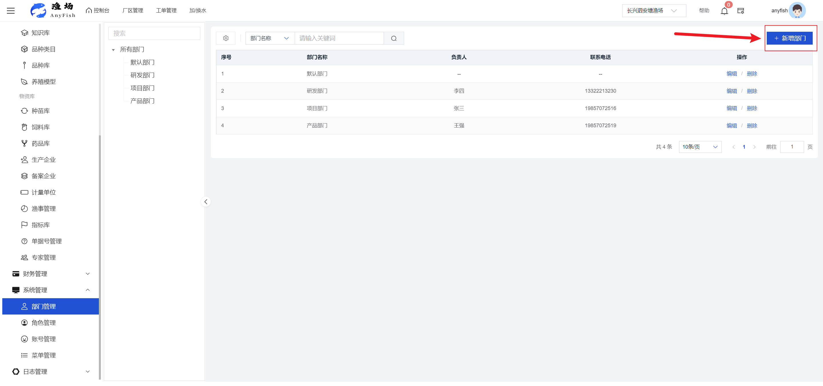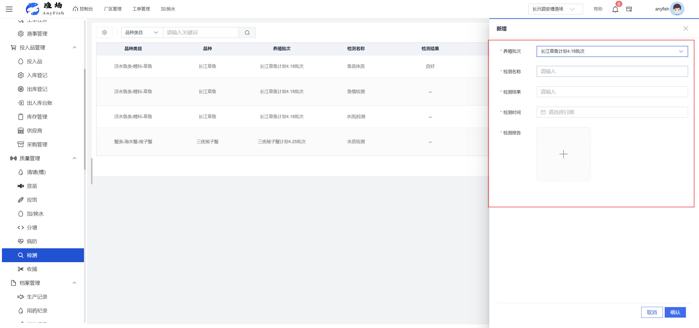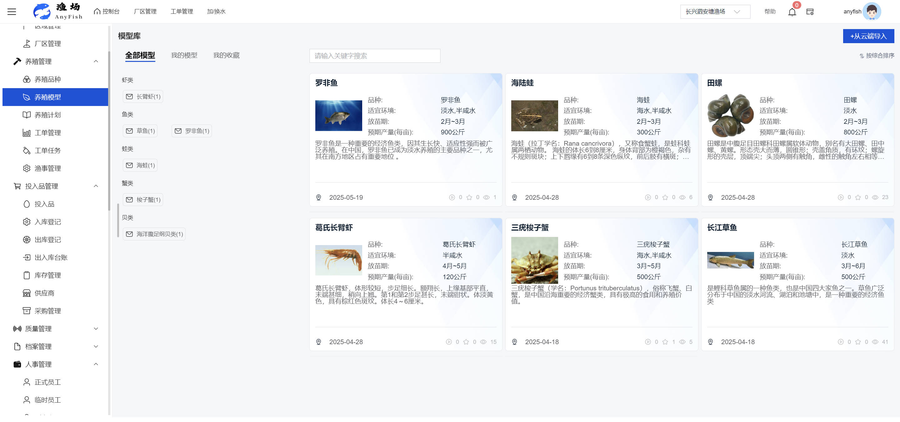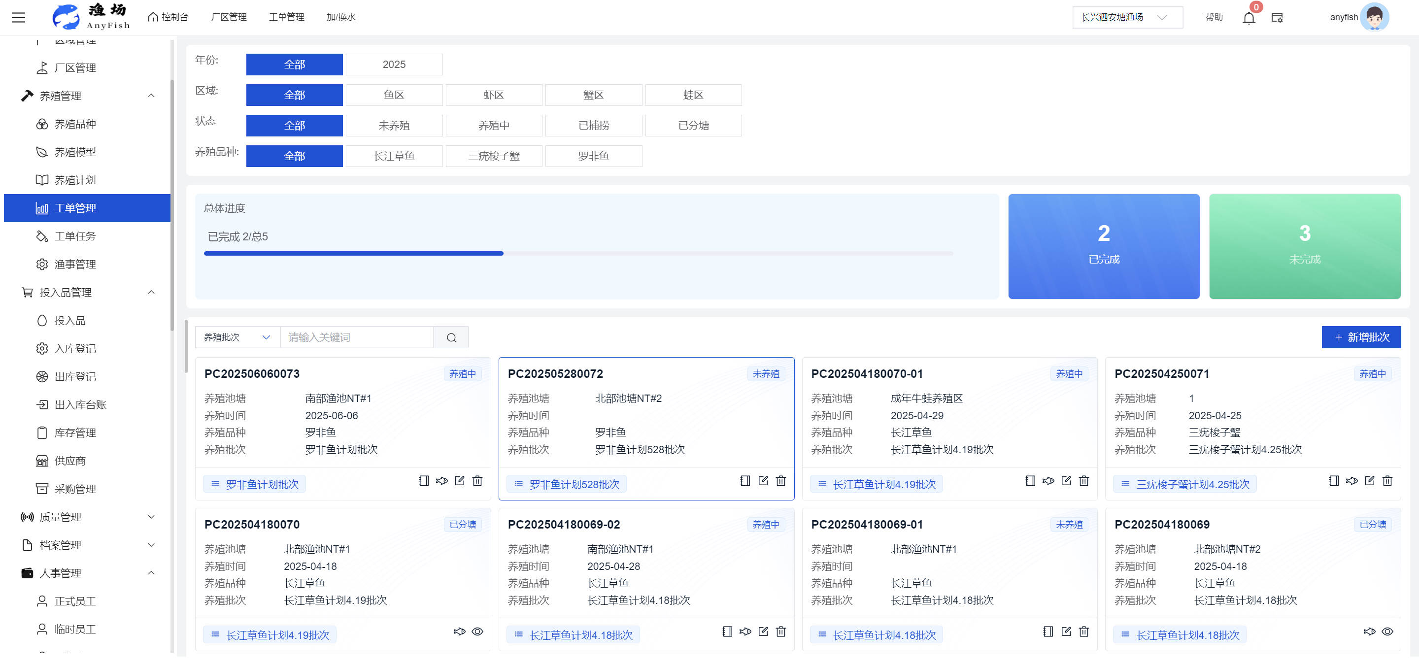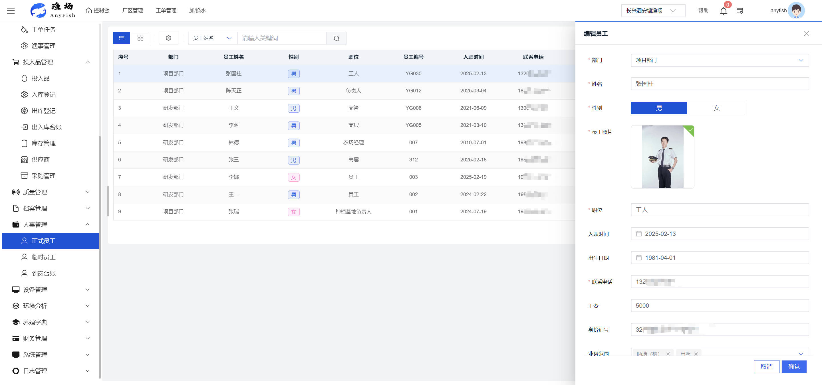 一、操作指南 1.1渔场概况 界面功能概述: 该界面作为渔场的首页及控制台界面,为用户呈现了渔场的整体概况信息。在这里,用户能够清晰地查看到渔场的数量、各个厂区的数量、当前在职的员工人数、实时的天气状况、已安装的摄像头设备数量以及是否存在离线设备等重要信息。同时,该界面还为用户提供了便捷的操作入口,例如可以进行渔场的管理操作以及新增员工等常用功能,方便用户对渔场的基本信息进行快速的了解和管理。  4.1.1.1 渔场概况 界面功能概述: 用户可以点击标红的地方跳转到渔场管理跳转到渔场管理界面。  用户点击界面中标红的区域即可跳转到渔场管理界面。在该界面中,用户可以全面了解渔场的各项详细信息,如渔场的占地面积、具体的养殖区域划分、在职员工的数量及基本信息、各类设备的运行情况、今日和明日的农事安排等。这些信息的展示有助于用户对渔场的整体运营状况有一个清晰的认识,同时也为后续的管理决策提供了有力的数据支持。此外,用户还可以在该界面进行一些基础的管理操作,如编辑渔场的基本信息、调整设备的设置等,以确保渔场的各项工作能够顺利进行。  4.1.1.2 渔场渔事 界面功能概述: 用户可以通过点击界面中标红的区域进入不同的渔事管理模块,例如培肥、投饵、收捕等常见的农事活动。  4.1.1.3 新增用户 界面元素功能概述: 该界面主要用于用户进行新增用户以及添加用户权限的操作。在渔场的日常运营中,可能需要不断添加新的员工或管理人员,并为他们分配相应的权限,以便他们能够顺利地完成各自的工作任务。通过该界面,用户可以方便地完成这些操作,确保渔场的人力资源管理更加高效和有序。  左侧搜索栏 :此搜索栏为用户提供了一个便捷的方式,允许用户在输入框内输入关键字,例如部门名称的关键词,从而快速搜索到特定的部门。这对于拥有多个部门的大型渔场来说,能够大大提高用户查找部门的效率,节省时间。 顶部搜索栏:在这里,用户可以在输入框内填写用户名称或关键词,以便快速搜索到特定的用户。当渔场员工数量较多时,通过关键词搜索能够迅速定位到目标用户,进而对其信息进行相应的操作,如查看、编辑或删除等。  新增用户按钮:点击该按钮后,系统会弹出一个新增用户的表单界面。  用户需要在该表单中填写完整的信息,包括但不限于用户名、密码、姓名、联系方式、所属部门、角色权限等。填写完成后,点击保存按钮,即可将新的用户成功添加到系统当中,使其能够登录并使用系统进行相关的工作操作。  编辑用户按钮:当用户需要修改员工的信息时,可以点击该按钮。  系统会跳转到员工信息编辑界面,在这里,用户可以对员工的基本信息、联系方式、角色权限等进行修改。修改完成后,点击保存按钮,即可使修改后的信息生效,确保员工的信息始终保持准确和更新。  删除按钮:如果需要删除某个员工账号,用户可以点击该删除按钮。系统会弹出一个确认对话框,提示用户是否确定要删除该员工。如果用户点击“是”,则系统将彻底删除该员工账号及其相关信息;如果用户点击“否”,则取消删除操作,员工账号保持不变。在删除员工账号时,用户需要谨慎操作,以免误删重要信息。  修改密码按钮:为了保障系统的安全性,用户可以通过点击该按钮来修改员工的密码。  在修改密码的界面中,用户需要输入新的密码并确认,然后点击保存按钮,即可完成密码的修改。修改后的密码将立即生效,员工需要使用新密码进行登录。这一功能在员工忘记密码或需要定期更新密码的情况下非常实用。  4.1.1.4 告警信息 界面功能概述: 该界面是一个渔场概况列表,主要展示渔场的基本情况以及各类告警信息。用户可以通过该界面查看渔场的详细信息,如渔场名称、位置、占地面积、当前的渔事活动等。  同时,系统会将各类告警信息以醒目的方式展示出来,包括设备故障告警、环境异常告警(如温度过高、湿度过低等)、渔事任务超时告警等。用户可以点击相应的告警信息,查看更多详细的告警内容,如告警发生的时间、具体的设备或区域、告警的严重程度等。此外,用户还可以在该界面进行一些相关的操作,如确认告警信息、查看告警处理进度、设置告警提醒方式等,以便及时处理各类问题,确保渔场的正常运营。  4.2渔场管理 4.2.1.渔场管理 摄像头管理 :用户可以在该界面中对摄像头进行添加、删除、调整位置等操作。通过合理配置摄像头,用户可以实现对渔场各个区域的实时监控,便于及时发现异常情况,保障渔场的安全。  4.2.2 厂区管理 界面功能概述 该界面是一个池塘列表,主要用于查看池塘的详细信息,包括池塘的占地面积、养殖模型、养殖面积、生长周期等。用户可以通过该界面全面了解各个池塘的基本情况,为养殖规划和渔事安排提供重要依据。同时,该界面还为用户提供了多种操作功能,如池塘管理操作、查看池塘详细信息等,方便用户对地块进行有效的管理和维护。  4.2.2.1 池塘管理:  添加旁边的搜索框(与添加按钮分开) :该搜索框允许用户输入关键词,如池塘名称、投入品名称或相关信息,进行快速搜索。通过输入关键词,系统将自动筛选出符合条件的池塘信息,方便用户在众多地块中快速找到目标池塘,提高工作效率。 添加按钮 :用户可以在右侧输入要添加的池塘信息,