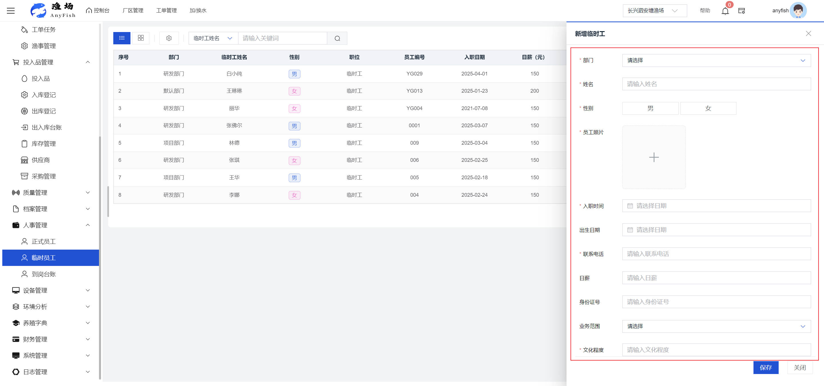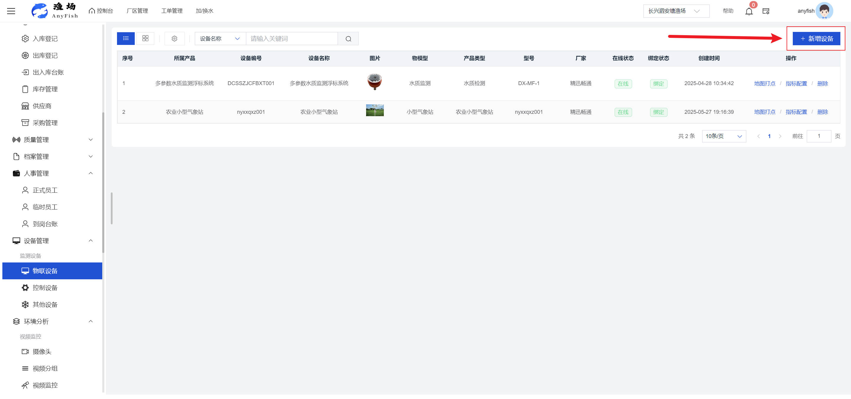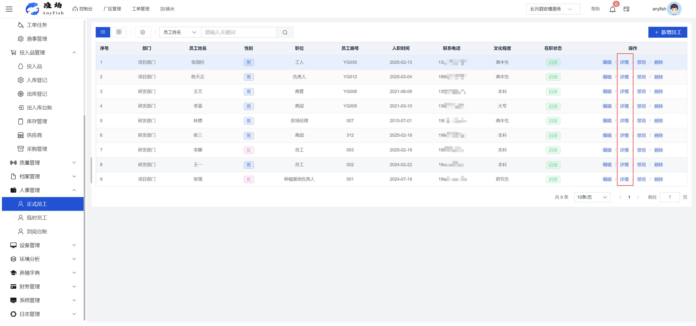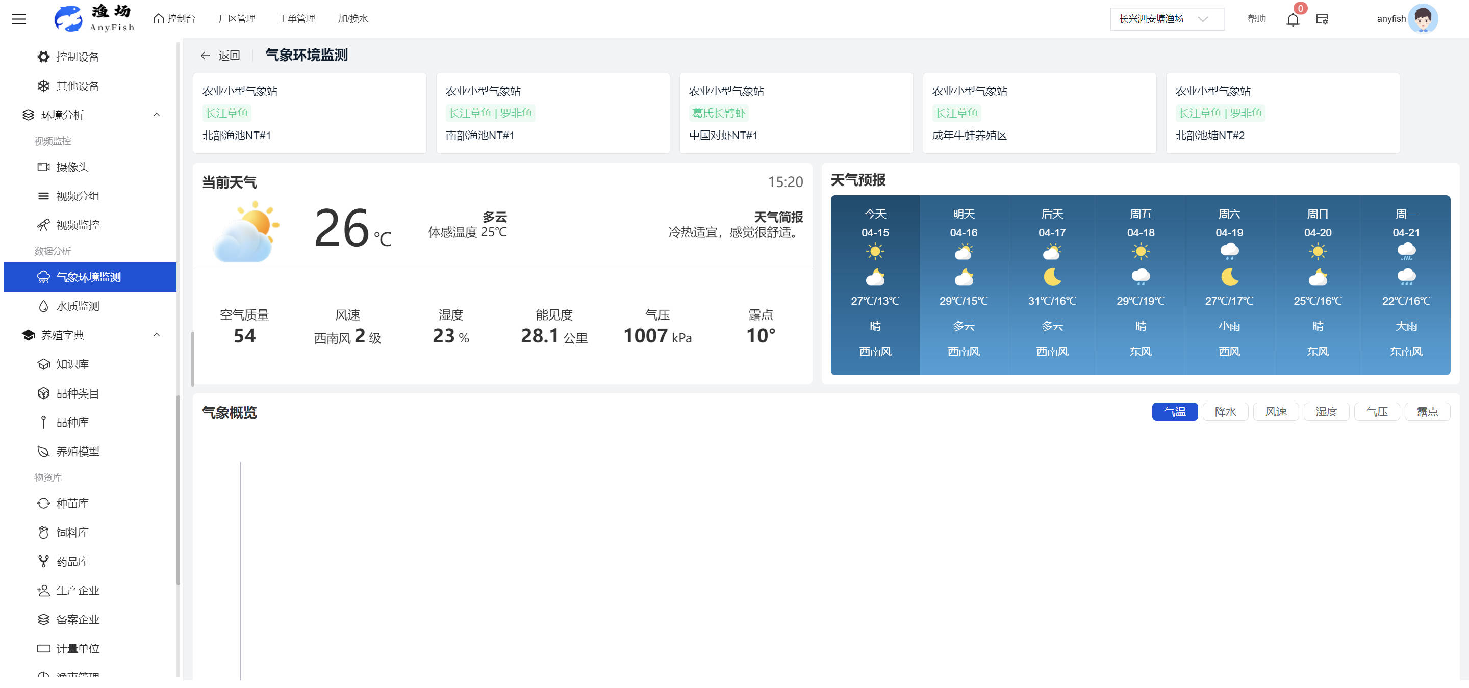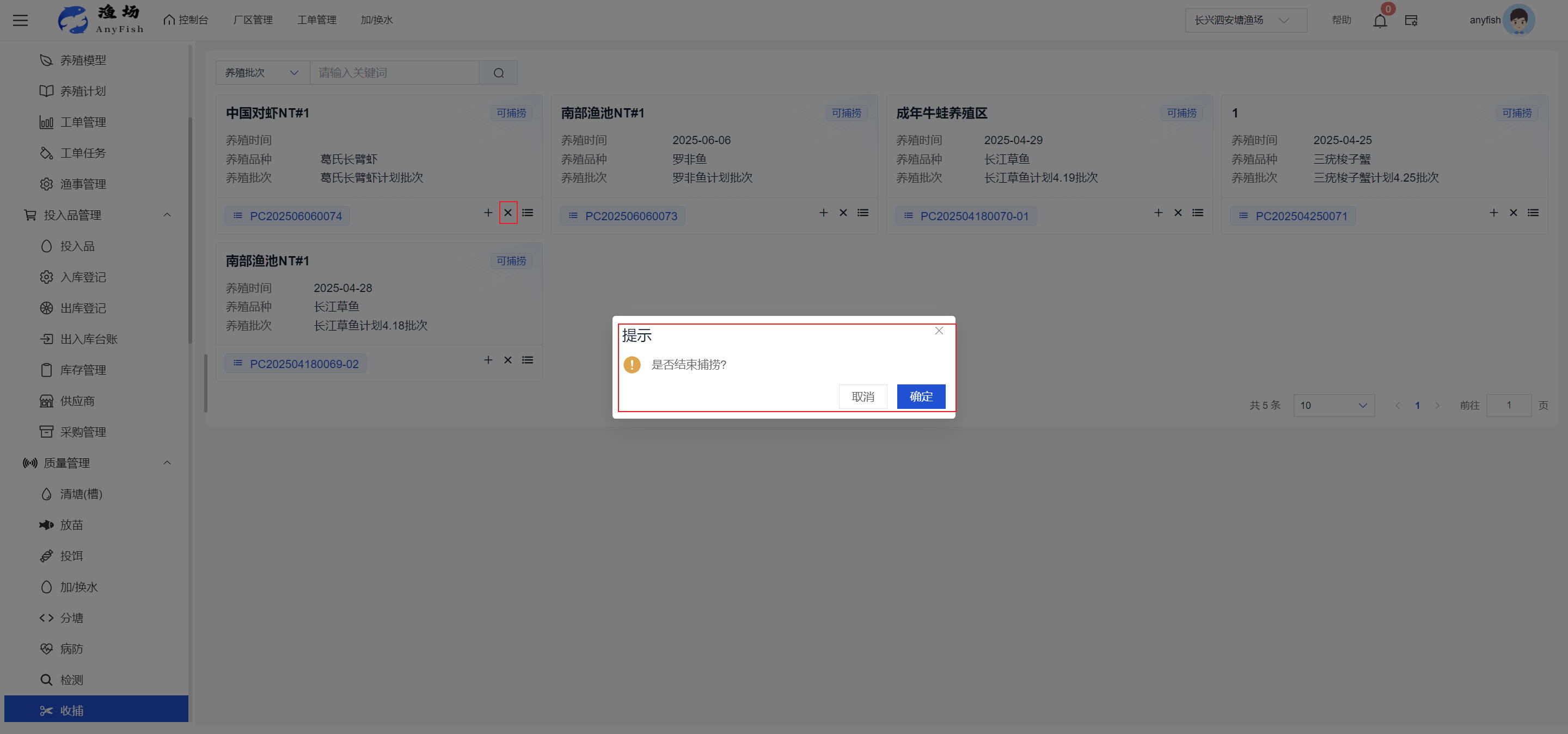 一、操作指南 1.1渔场概况 界面功能概述: 该界面作为渔场的首页及控制台界面,为用户呈现了渔场的整体概况信息。在这里,用户能够清晰地查看到渔场的数量、各个厂区的数量、当前在职的员工人数、实时的天气状况、已安装的摄像头设备数量以及是否存在离线设备等重要信息。同时,该界面还为用户提供了便捷的操作入口,例如可以进行渔场的管理操作以及新增员工等常用功能,方便用户对渔场的基本信息进行快速的了解和管理。  4.1.1.1 渔场概况 界面功能概述: 用户可以点击标红的地方跳转到渔场管理跳转到渔场管理界面。  用户点击界面中标红的区域即可跳转到渔场管理界面。在该界面中,用户可以全面了解渔场的各项详细信息,如渔场的占地面积、具体的养殖区域划分、在职员工的数量及基本信息、各类设备的运行情况、今日和明日的农事安排等。这些信息的展示有助于用户对渔场的整体运营状况有一个清晰的认识,同时也为后续的管理决策提供了有力的数据支持。此外,用户还可以在该界面进行一些基础的管理操作,如编辑渔场的基本信息、调整设备的设置等,以确保渔场的各项工作能够顺利进行。  4.1.1.2 渔场渔事 界面功能概述: 用户可以通过点击界面中标红的区域进入不同的渔事管理模块,例如培肥、投饵、收捕等常见的农事活动。  4.1.1.3 新增用户 界面元素功能概述: 该界面主要用于用户进行新增用户以及添加用户权限的操作。在渔场的日常运营中,可能需要不断添加新的员工或管理人员,并为他们分配相应的权限,以便他们能够顺利地完成各自的工作任务。通过该界面,用户可以方便地完成这些操作,确保渔场的人力资源管理更加高效和有序。  左侧搜索栏 :此搜索栏为用户提供了一个便捷的方式,允许用户在输入框内输入关键字,例如部门名称的关键词,从而快速搜索到特定的部门。这对于拥有多个部门的大型渔场来说,能够大大提高用户查找部门的效率,节省时间。 顶部搜索栏:在这里,用户可以在输入框内填写用户名称或关键词,以便快速搜索到特定的用户。当渔场员工数量较多时,通过关键词搜索能够迅速定位到目标用户,进而对其信息进行相应的操作,如查看、编辑或删除等。  新增用户按钮:点击该按钮后,系统会弹出一个新增用户的表单界面。  用户需要在该表单中填写完整的信息,包括但不限于用户名、密码、姓名、联系方式、所属部门、角色权限等。填写完成后,点击保存按钮,即可将新的用户成功添加到系统当中,使其能够登录并使用系统进行相关的工作操作。  编辑用户按钮:当用户需要修改员工的信息时,可以点击该按钮。  系统会跳转到员工信息编辑界面,在这里,用户可以对员工的基本信息、联系方式、角色权限等进行修改。修改完成后,点击保存按钮,即可使修改后的信息生效,确保员工的信息始终保持准确和更新。  删除按钮:如果需要删除某个员工账号,用户可以点击该删除按钮。系统会弹出一个确认对话框,提示用户是否确定要删除该员工。如果用户点击“是”,则系统将彻底删除该员工账号及其相关信息;如果用户点击“否”,则取消删除操作,员工账号保持不变。在删除员工账号时,用户需要谨慎操作,以免误删重要信息。  修改密码按钮:为了保障系统的安全性,用户可以通过点击该按钮来修改员工的密码。  在修改密码的界面中,用户需要输入新的密码并确认,然后点击保存按钮,即可完成密码的修改。修改后的密码将立即生效,员工需要使用新密码进行登录。这一功能在员工忘记密码或需要定期更新密码的情况下非常实用。  4.1.1.4 告警信息 界面功能概述: 该界面是一个渔场概况列表,主要展示渔场的基本情况以及各类告警信息。用户可以通过该界面查看渔场的详细信息,如渔场名称、位置、占地面积、当前的渔事活动等。  同时,系统会将各类告警信息以醒目的方式展示出来,包括设备故障告警、环境异常告警(如温度过高、湿度过低等)、渔事任务超时告警等。用户可以点击相应的告警信息,查看更多详细的告警内容,如告警发生的时间、具体的设备或区域、告警的严重程度等。此外,用户还可以在该界面进行一些相关的操作,如确认告警信息、查看告警处理进度、设置告警提醒方式等,以便及时处理各类问题,确保渔场的正常运营。  4.2渔场管理 4.2.1.渔场管理 摄像头管理 :用户可以在该界面中对摄像头进行添加、删除、调整位置等操作。通过合理配置摄像头,用户可以实现对渔场各个区域的实时监控,便于及时发现异常情况,保障渔场的安全。  4.2.2 厂区管理 界面功能概述 该界面是一个池塘列表,主要用于查看池塘的详细信息,包括池塘的占地面积、养殖模型、养殖面积、生长周期等。用户可以通过该界面全面了解各个池塘的基本情况,为养殖规划和渔事安排提供重要依据。同时,该界面还为用户提供了多种操作功能,如池塘管理操作、查看池塘详细信息等,方便用户对地块进行有效的管理和维护。  4.2.2.1 池塘管理:  添加旁边的搜索框(与添加按钮分开) :该搜索框允许用户输入关键词,如池塘名称、投入品名称或相关信息,进行快速搜索。通过输入关键词,系统将自动筛选出符合条件的池塘信息,方便用户在众多地块中快速找到目标池塘,提高工作效率。 添加按钮 :用户可以在右侧输入要添加的池塘信息,