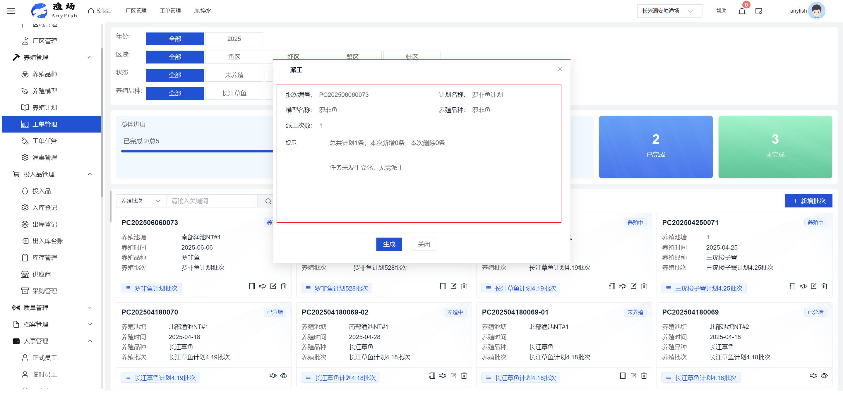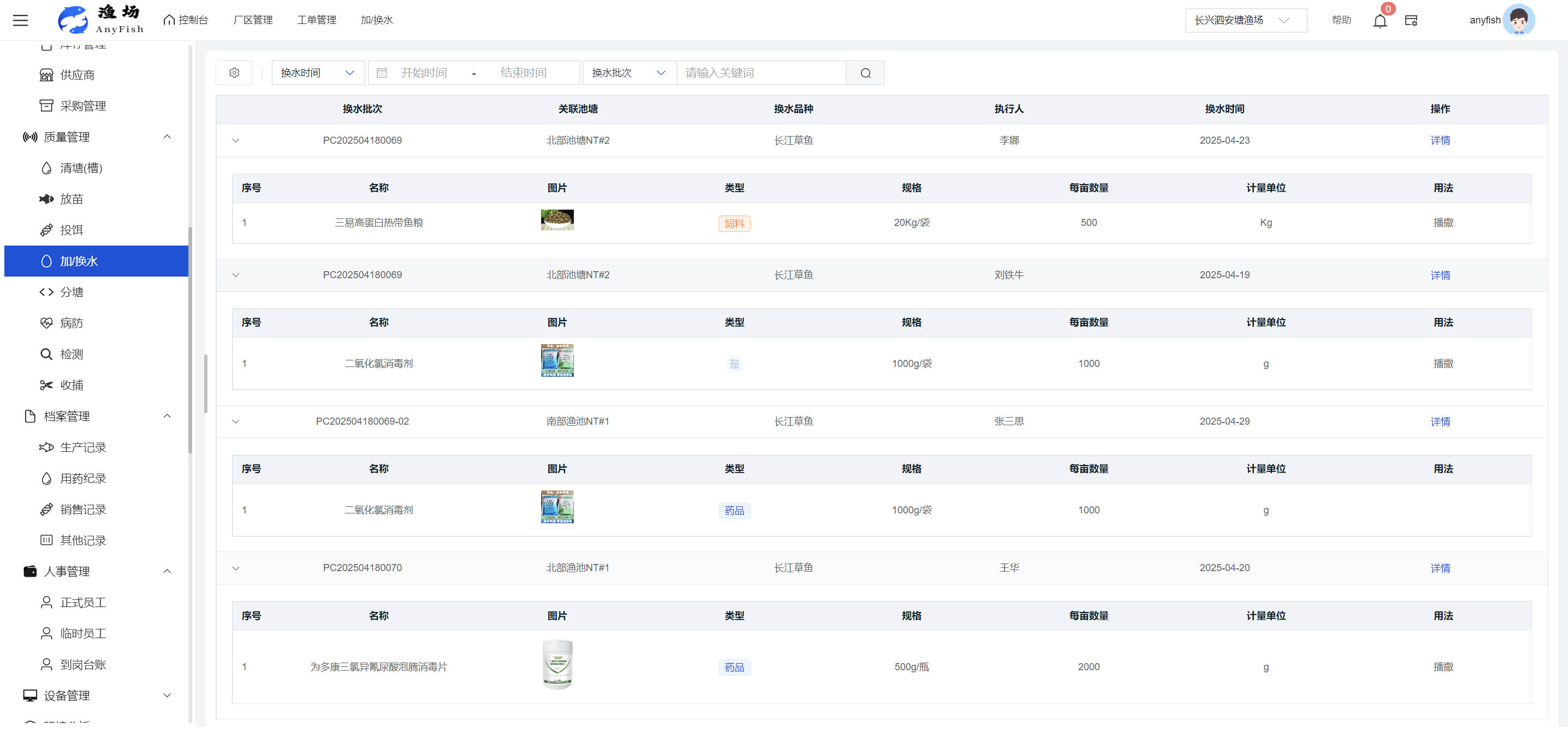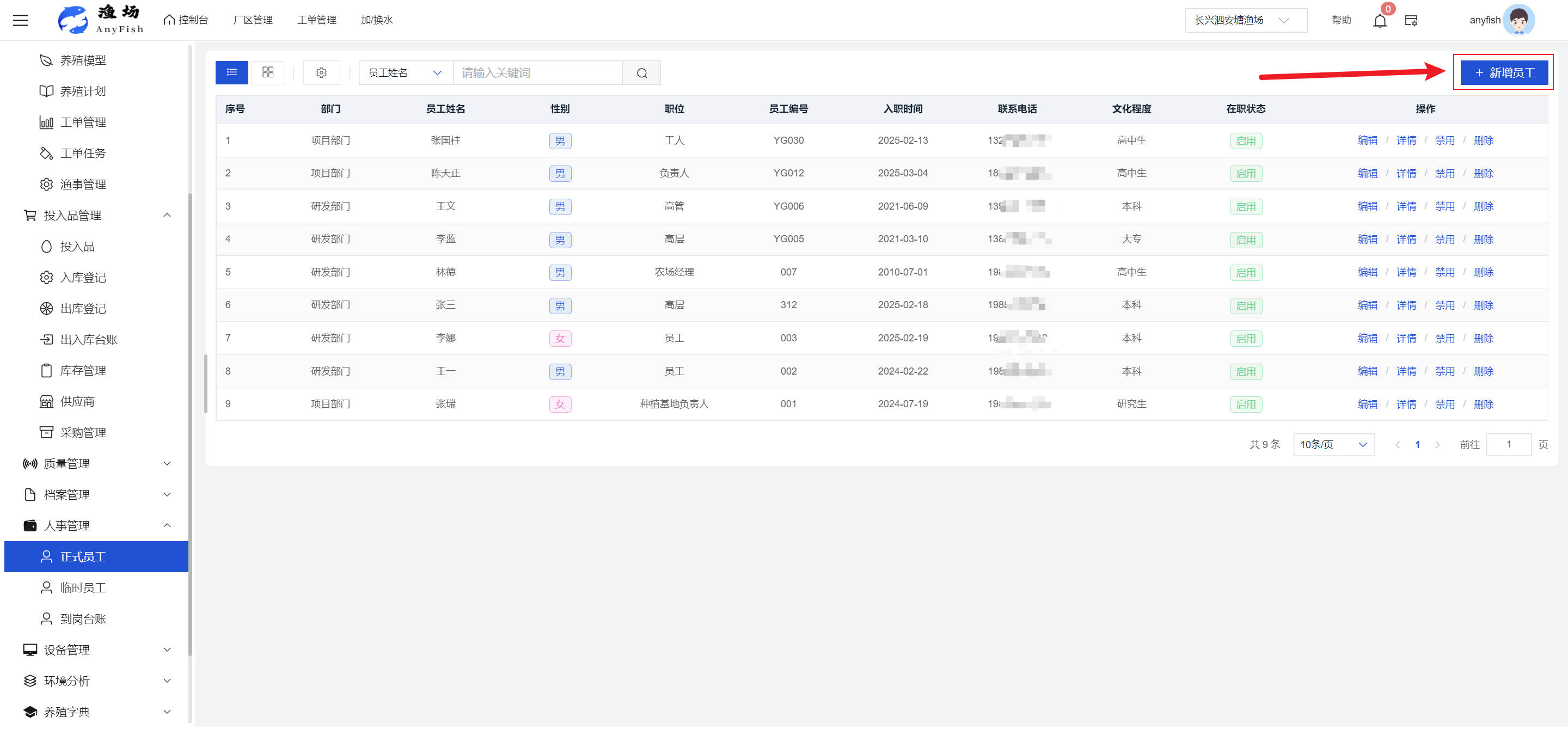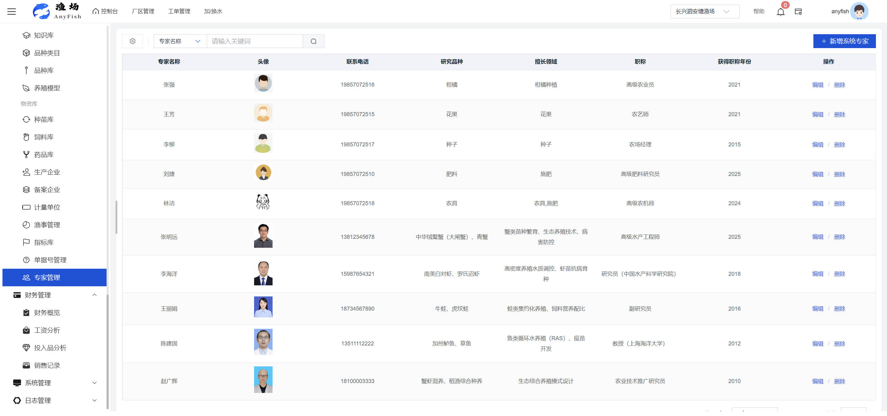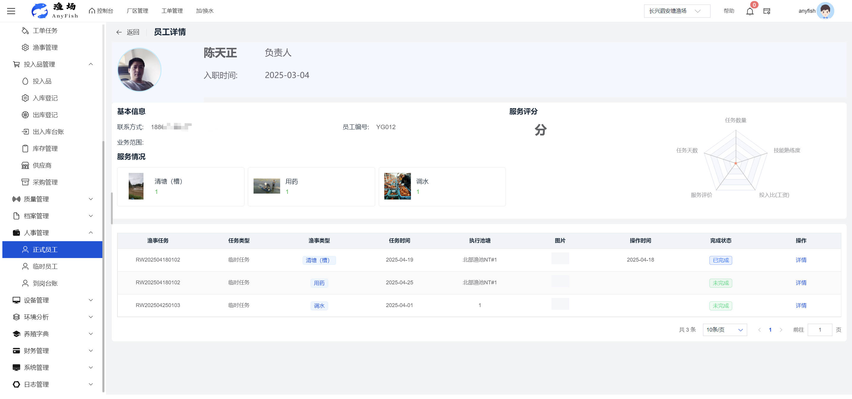 一、操作指南 1.1渔场概况 界面功能概述: 该界面作为渔场的首页及控制台界面,为用户呈现了渔场的整体概况信息。在这里,用户能够清晰地查看到渔场的数量、各个厂区的数量、当前在职的员工人数、实时的天气状况、已安装的摄像头设备数量以及是否存在离线设备等重要信息。同时,该界面还为用户提供了便捷的操作入口,例如可以进行渔场的管理操作以及新增员工等常用功能,方便用户对渔场的基本信息进行快速的了解和管理。  4.1.1.1 渔场概况 界面功能概述: 用户可以点击标红的地方跳转到渔场管理跳转到渔场管理界面。  用户点击界面中标红的区域即可跳转到渔场管理界面。在该界面中,用户可以全面了解渔场的各项详细信息,如渔场的占地面积、具体的养殖区域划分、在职员工的数量及基本信息、各类设备的运行情况、今日和明日的农事安排等。这些信息的展示有助于用户对渔场的整体运营状况有一个清晰的认识,同时也为后续的管理决策提供了有力的数据支持。此外,用户还可以在该界面进行一些基础的管理操作,如编辑渔场的基本信息、调整设备的设置等,以确保渔场的各项工作能够顺利进行。  4.1.1.2 渔场渔事 界面功能概述: 用户可以通过点击界面中标红的区域进入不同的渔事管理模块,例如培肥、投饵、收捕等常见的农事活动。  4.1.1.3 新增用户 界面元素功能概述: 该界面主要用于用户进行新增用户以及添加用户权限的操作。在渔场的日常运营中,可能需要不断添加新的员工或管理人员,并为他们分配相应的权限,以便他们能够顺利地完成各自的工作任务。通过该界面,用户可以方便地完成这些操作,确保渔场的人力资源管理更加高效和有序。  左侧搜索栏 :此搜索栏为用户提供了一个便捷的方式,允许用户在输入框内输入关键字,例如部门名称的关键词,从而快速搜索到特定的部门。这对于拥有多个部门的大型渔场来说,能够大大提高用户查找部门的效率,节省时间。 顶部搜索栏:在这里,用户可以在输入框内填写用户名称或关键词,以便快速搜索到特定的用户。当渔场员工数量较多时,通过关键词搜索能够迅速定位到目标用户,进而对其信息进行相应的操作,如查看、编辑或删除等。  新增用户按钮:点击该按钮后,系统会弹出一个新增用户的表单界面。  用户需要在该表单中填写完整的信息,包括但不限于用户名、密码、姓名、联系方式、所属部门、角色权限等。填写完成后,点击保存按钮,即可将新的用户成功添加到系统当中,使其能够登录并使用系统进行相关的工作操作。  编辑用户按钮:当用户需要修改员工的信息时,可以点击该按钮。  系统会跳转到员工信息编辑界面,在这里,用户可以对员工的基本信息、联系方式、角色权限等进行修改。修改完成后,点击保存按钮,即可使修改后的信息生效,确保员工的信息始终保持准确和更新。  删除按钮:如果需要删除某个员工账号,用户可以点击该删除按钮。系统会弹出一个确认对话框,提示用户是否确定要删除该员工。如果用户点击“是”,则系统将彻底删除该员工账号及其相关信息;如果用户点击“否”,则取消删除操作,员工账号保持不变。在删除员工账号时,用户需要谨慎操作,以免误删重要信息。  修改密码按钮:为了保障系统的安全性,用户可以通过点击该按钮来修改员工的密码。  在修改密码的界面中,用户需要输入新的密码并确认,然后点击保存按钮,即可完成密码的修改。修改后的密码将立即生效,员工需要使用新密码进行登录。这一功能在员工忘记密码或需要定期更新密码的情况下非常实用。  4.1.1.4 告警信息 界面功能概述: 该界面是一个渔场概况列表,主要展示渔场的基本情况以及各类告警信息。用户可以通过该界面查看渔场的详细信息,如渔场名称、位置、占地面积、当前的渔事活动等。  同时,系统会将各类告警信息以醒目的方式展示出来,包括设备故障告警、环境异常告警(如温度过高、湿度过低等)、渔事任务超时告警等。用户可以点击相应的告警信息,查看更多详细的告警内容,如告警发生的时间、具体的设备或区域、告警的严重程度等。此外,用户还可以在该界面进行一些相关的操作,如确认告警信息、查看告警处理进度、设置告警提醒方式等,以便及时处理各类问题,确保渔场的正常运营。  4.2渔场管理 4.2.1.渔场管理 摄像头管理 :用户可以在该界面中对摄像头进行添加、删除、调整位置等操作。通过合理配置摄像头,用户可以实现对渔场各个区域的实时监控,便于及时发现异常情况,保障渔场的安全。  4.2.2 厂区管理 界面功能概述 该界面是一个池塘列表,主要用于查看池塘的详细信息,包括池塘的占地面积、养殖模型、养殖面积、生长周期等。用户可以通过该界面全面了解各个池塘的基本情况,为养殖规划和渔事安排提供重要依据。同时,该界面还为用户提供了多种操作功能,如池塘管理操作、查看池塘详细信息等,方便用户对地块进行有效的管理和维护。  4.2.2.1 池塘管理:  添加旁边的搜索框(与添加按钮分开) :该搜索框允许用户输入关键词,如池塘名称、投入品名称或相关信息,进行快速搜索。通过输入关键词,系统将自动筛选出符合条件的池塘信息,方便用户在众多地块中快速找到目标池塘,提高工作效率。 添加按钮 :用户可以在右侧输入要添加的池塘信息,
