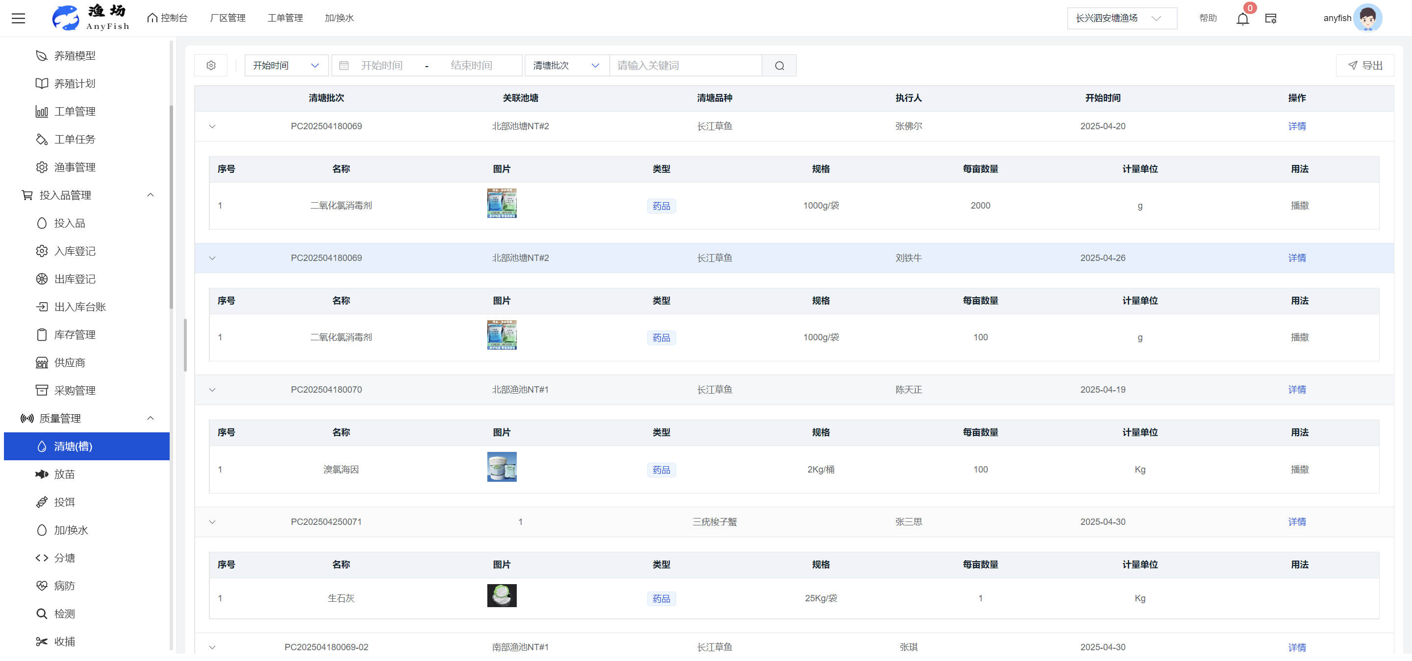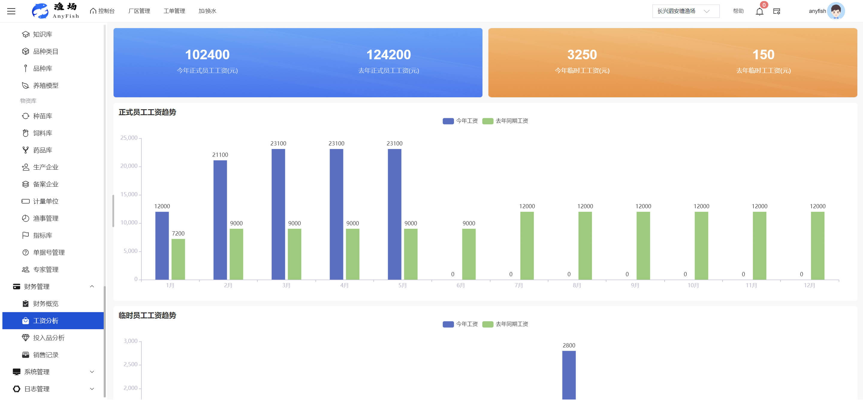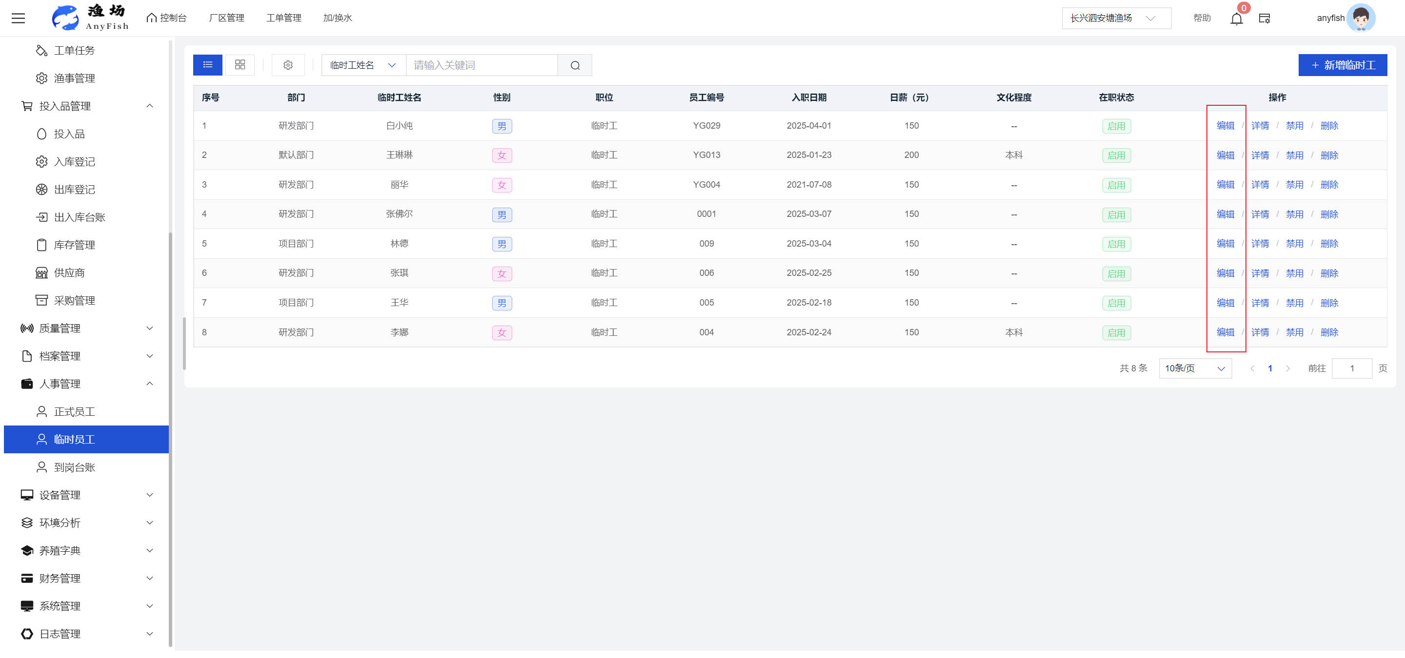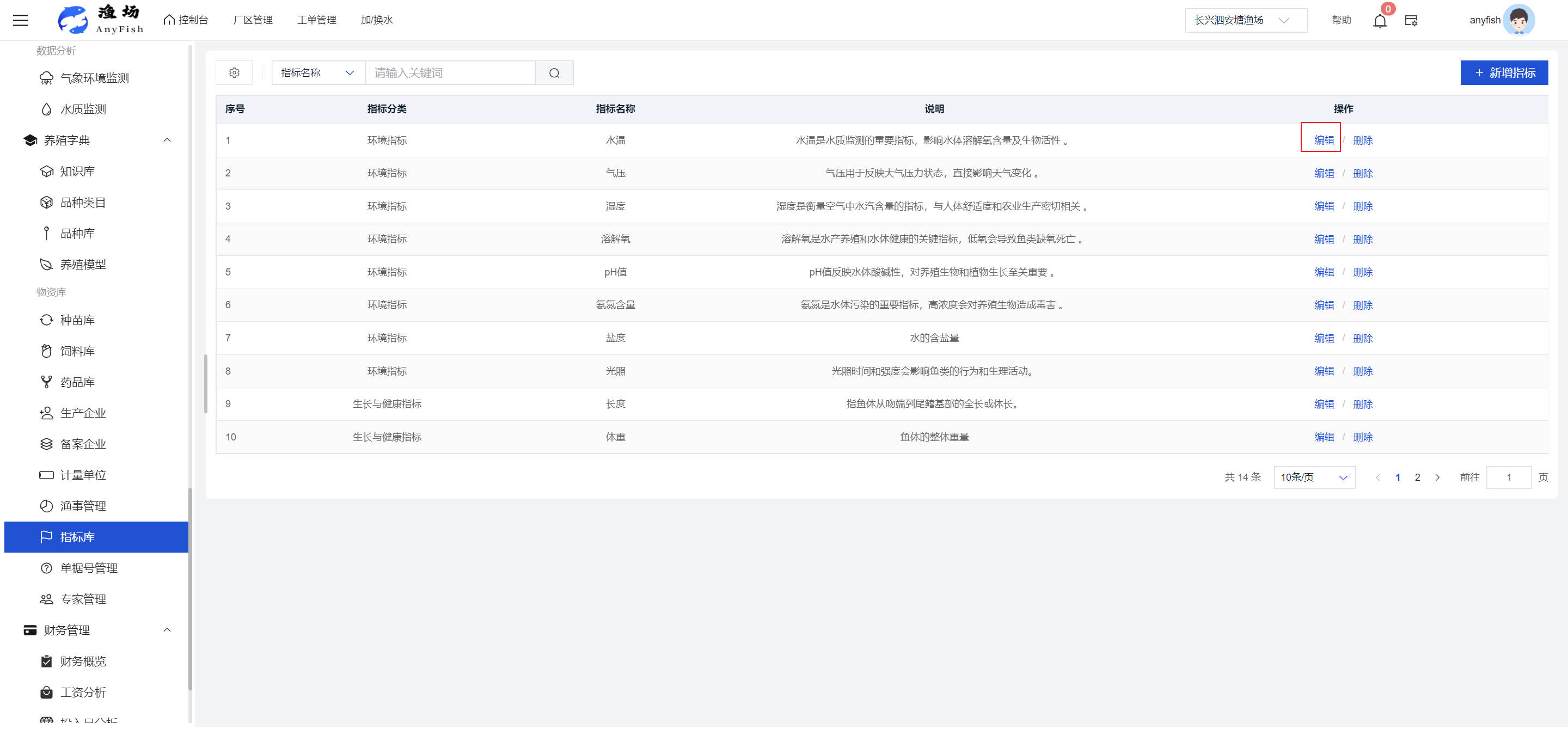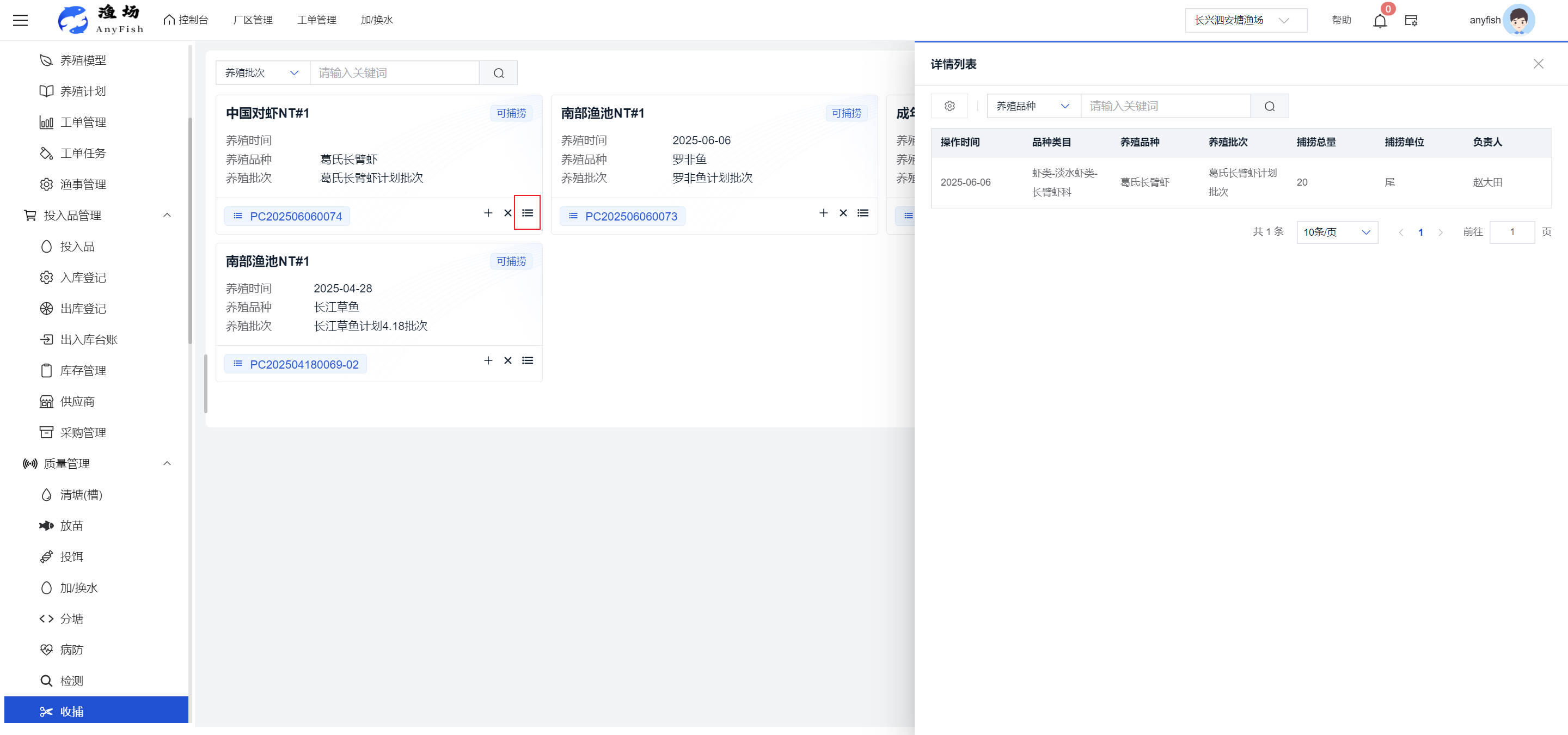 一、操作指南 1.1渔场概况 界面功能概述: 该界面作为渔场的首页及控制台界面,为用户呈现了渔场的整体概况信息。在这里,用户能够清晰地查看到渔场的数量、各个厂区的数量、当前在职的员工人数、实时的天气状况、已安装的摄像头设备数量以及是否存在离线设备等重要信息。同时,该界面还为用户提供了便捷的操作入口,例如可以进行渔场的管理操作以及新增员工等常用功能,方便用户对渔场的基本信息进行快速的了解和管理。  4.1.1.1 渔场概况 界面功能概述: 用户可以点击标红的地方跳转到渔场管理跳转到渔场管理界面。  用户点击界面中标红的区域即可跳转到渔场管理界面。在该界面中,用户可以全面了解渔场的各项详细信息,如渔场的占地面积、具体的养殖区域划分、在职员工的数量及基本信息、各类设备的运行情况、今日和明日的农事安排等。这些信息的展示有助于用户对渔场的整体运营状况有一个清晰的认识,同时也为后续的管理决策提供了有力的数据支持。此外,用户还可以在该界面进行一些基础的管理操作,如编辑渔场的基本信息、调整设备的设置等,以确保渔场的各项工作能够顺利进行。  4.1.1.2 渔场渔事 界面功能概述: 用户可以通过点击界面中标红的区域进入不同的渔事管理模块,例如培肥、投饵、收捕等常见的农事活动。  4.1.1.3 新增用户 界面元素功能概述: 该界面主要用于用户进行新增用户以及添加用户权限的操作。在渔场的日常运营中,可能需要不断添加新的员工或管理人员,并为他们分配相应的权限,以便他们能够顺利地完成各自的工作任务。通过该界面,用户可以方便地完成这些操作,确保渔场的人力资源管理更加高效和有序。  左侧搜索栏 :此搜索栏为用户提供了一个便捷的方式,允许用户在输入框内输入关键字,例如部门名称的关键词,从而快速搜索到特定的部门。这对于拥有多个部门的大型渔场来说,能够大大提高用户查找部门的效率,节省时间。 顶部搜索栏:在这里,用户可以在输入框内填写用户名称或关键词,以便快速搜索到特定的用户。当渔场员工数量较多时,通过关键词搜索能够迅速定位到目标用户,进而对其信息进行相应的操作,如查看、编辑或删除等。  新增用户按钮:点击该按钮后,系统会弹出一个新增用户的表单界面。  用户需要在该表单中填写完整的信息,包括但不限于用户名、密码、姓名、联系方式、所属部门、角色权限等。填写完成后,点击保存按钮,即可将新的用户成功添加到系统当中,使其能够登录并使用系统进行相关的工作操作。  编辑用户按钮:当用户需要修改员工的信息时,可以点击该按钮。  系统会跳转到员工信息编辑界面,在这里,用户可以对员工的基本信息、联系方式、角色权限等进行修改。修改完成后,点击保存按钮,即可使修改后的信息生效,确保员工的信息始终保持准确和更新。  删除按钮:如果需要删除某个员工账号,用户可以点击该删除按钮。系统会弹出一个确认对话框,提示用户是否确定要删除该员工。如果用户点击“是”,则系统将彻底删除该员工账号及其相关信息;如果用户点击“否”,则取消删除操作,员工账号保持不变。在删除员工账号时,用户需要谨慎操作,以免误删重要信息。  修改密码按钮:为了保障系统的安全性,用户可以通过点击该按钮来修改员工的密码。  在修改密码的界面中,用户需要输入新的密码并确认,然后点击保存按钮,即可完成密码的修改。修改后的密码将立即生效,员工需要使用新密码进行登录。这一功能在员工忘记密码或需要定期更新密码的情况下非常实用。  4.1.1.4 告警信息 界面功能概述: 该界面是一个渔场概况列表,主要展示渔场的基本情况以及各类告警信息。用户可以通过该界面查看渔场的详细信息,如渔场名称、位置、占地面积、当前的渔事活动等。  同时,系统会将各类告警信息以醒目的方式展示出来,包括设备故障告警、环境异常告警(如温度过高、湿度过低等)、渔事任务超时告警等。用户可以点击相应的告警信息,查看更多详细的告警内容,如告警发生的时间、具体的设备或区域、告警的严重程度等。此外,用户还可以在该界面进行一些相关的操作,如确认告警信息、查看告警处理进度、设置告警提醒方式等,以便及时处理各类问题,确保渔场的正常运营。  4.2渔场管理 4.2.1.渔场管理 摄像头管理 :用户可以在该界面中对摄像头进行添加、删除、调整位置等操作。通过合理配置摄像头,用户可以实现对渔场各个区域的实时监控,便于及时发现异常情况,保障渔场的安全。  4.2.2 厂区管理 界面功能概述 该界面是一个池塘列表,主要用于查看池塘的详细信息,包括池塘的占地面积、养殖模型、养殖面积、生长周期等。用户可以通过该界面全面了解各个池塘的基本情况,为养殖规划和渔事安排提供重要依据。同时,该界面还为用户提供了多种操作功能,如池塘管理操作、查看池塘详细信息等,方便用户对地块进行有效的管理和维护。  4.2.2.1 池塘管理:  添加旁边的搜索框(与添加按钮分开) :该搜索框允许用户输入关键词,如池塘名称、投入品名称或相关信息,进行快速搜索。通过输入关键词,系统将自动筛选出符合条件的池塘信息,方便用户在众多地块中快速找到目标池塘,提高工作效率。 添加按钮 :用户可以在右侧输入要添加的池塘信息,