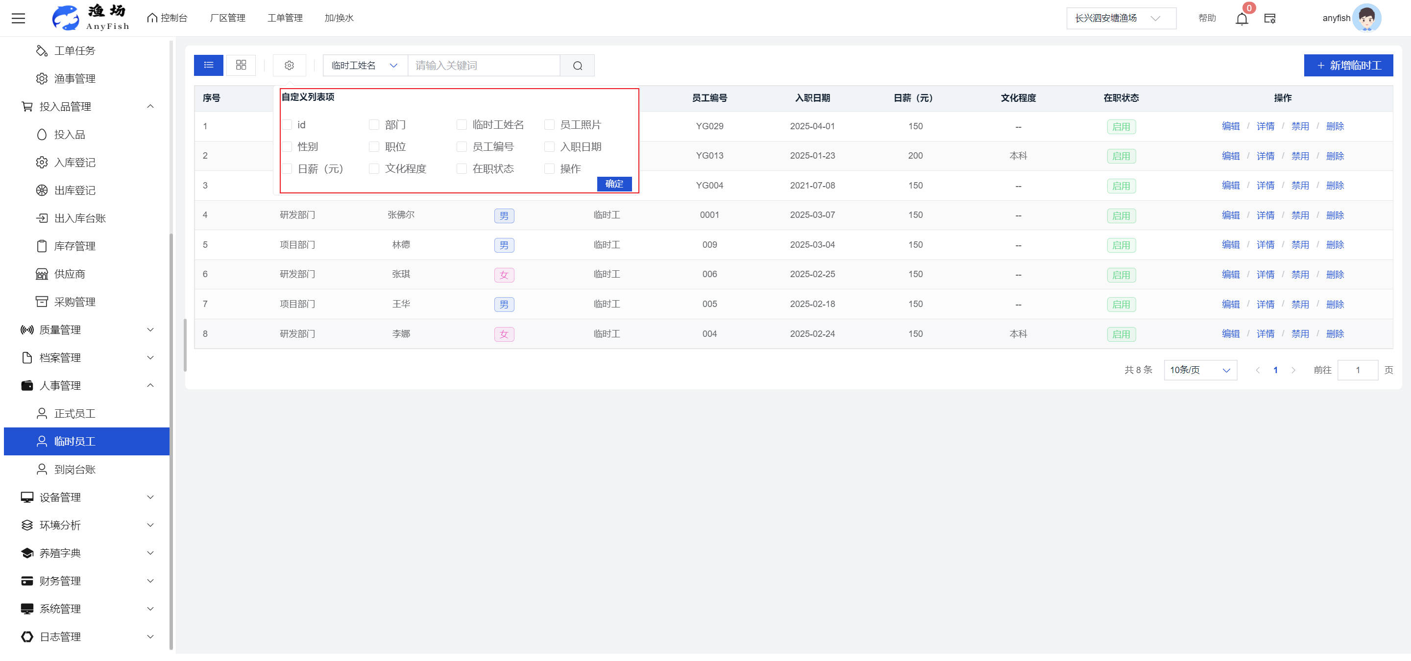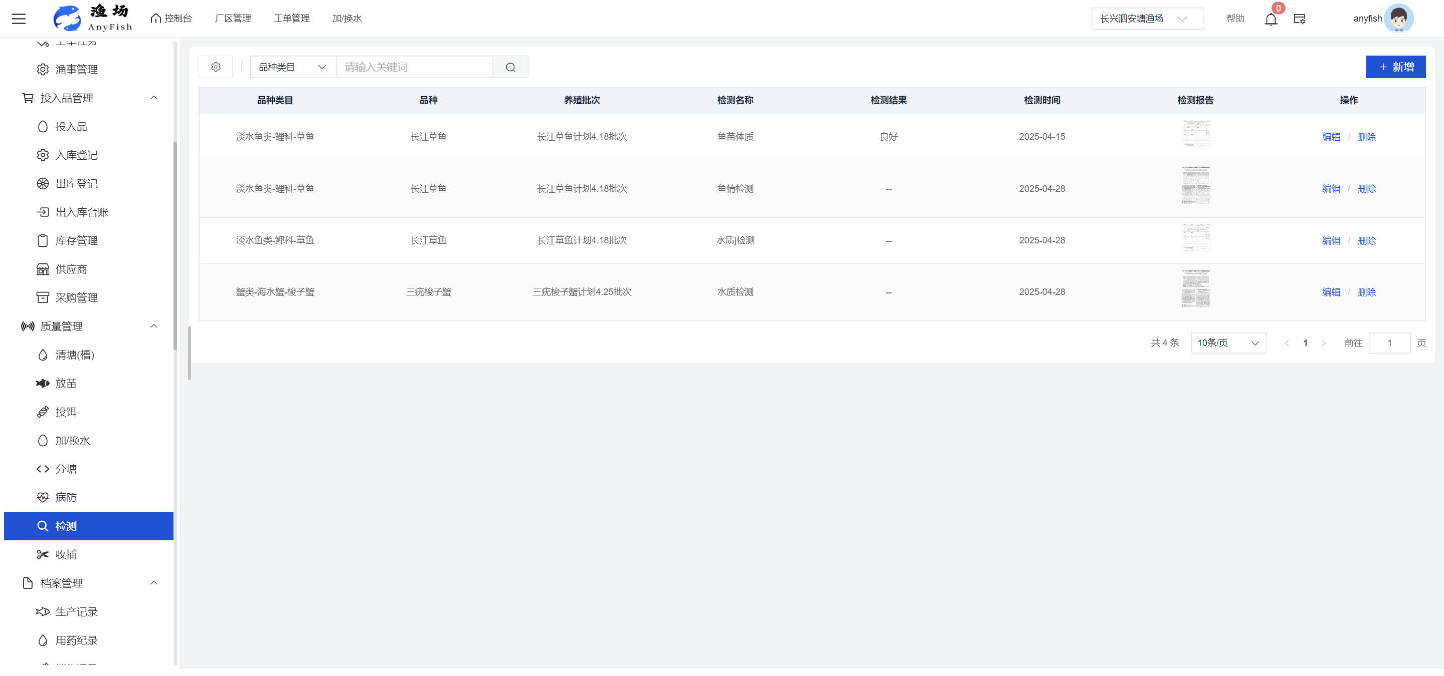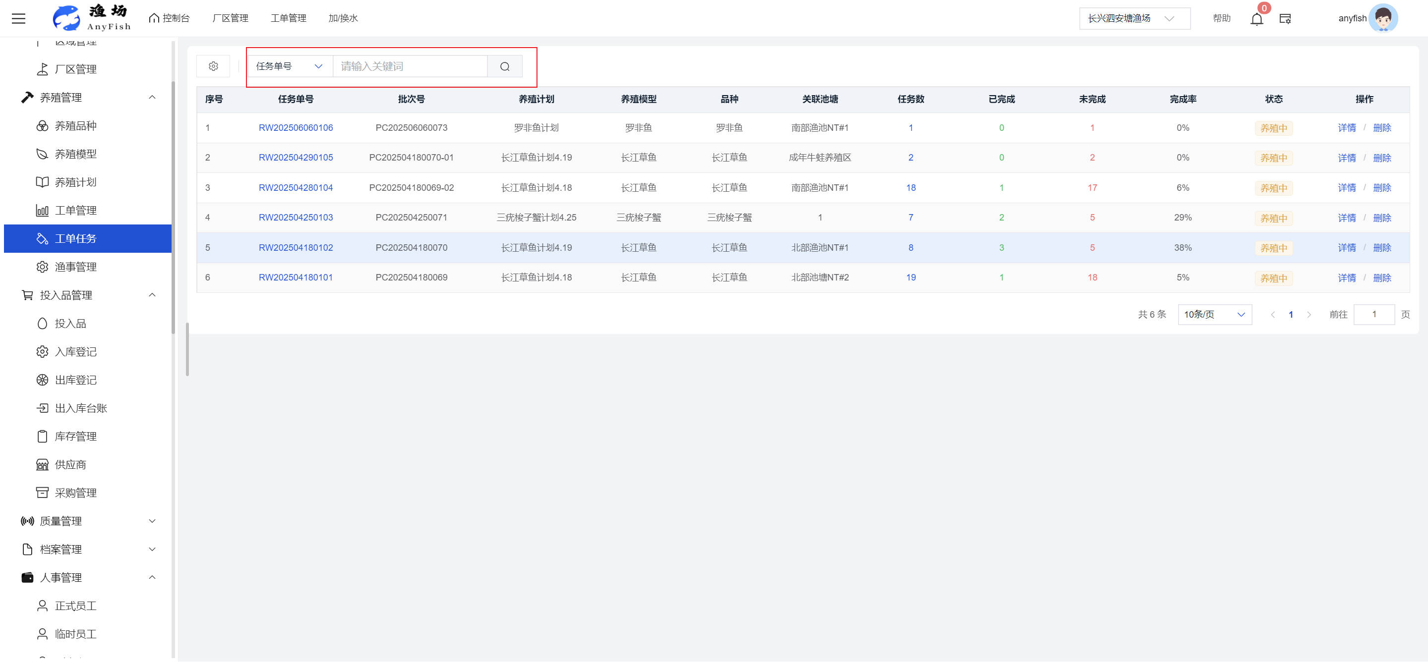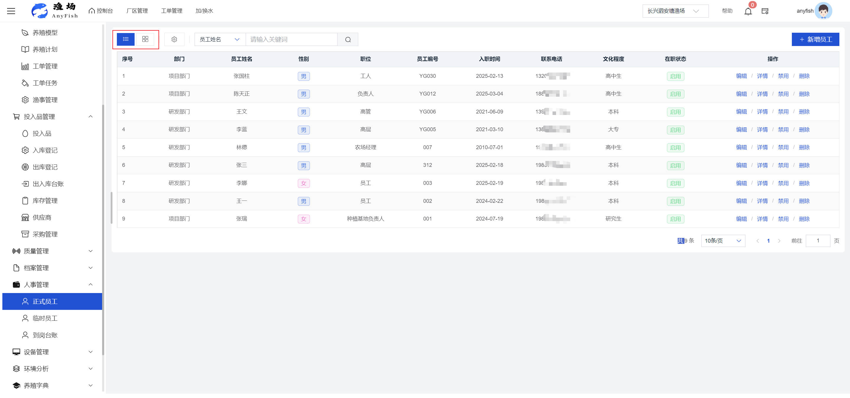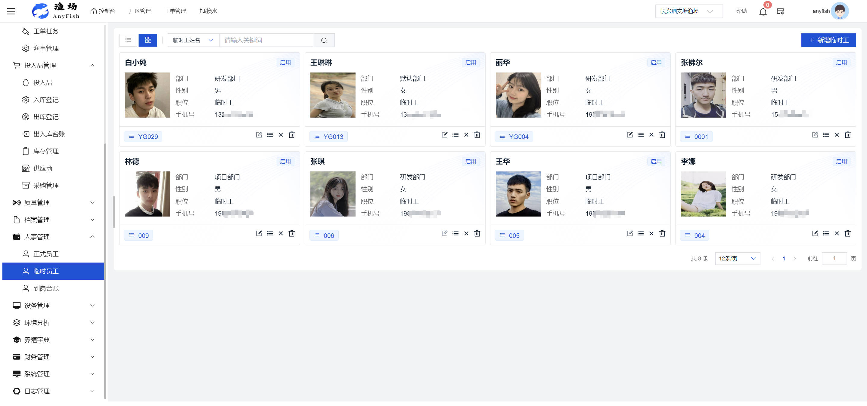 一、操作指南 1.1渔场概况 界面功能概述: 该界面作为渔场的首页及控制台界面,为用户呈现了渔场的整体概况信息。在这里,用户能够清晰地查看到渔场的数量、各个厂区的数量、当前在职的员工人数、实时的天气状况、已安装的摄像头设备数量以及是否存在离线设备等重要信息。同时,该界面还为用户提供了便捷的操作入口,例如可以进行渔场的管理操作以及新增员工等常用功能,方便用户对渔场的基本信息进行快速的了解和管理。  4.1.1.1 渔场概况 界面功能概述: 用户可以点击标红的地方跳转到渔场管理跳转到渔场管理界面。  用户点击界面中标红的区域即可跳转到渔场管理界面。在该界面中,用户可以全面了解渔场的各项详细信息,如渔场的占地面积、具体的养殖区域划分、在职员工的数量及基本信息、各类设备的运行情况、今日和明日的农事安排等。这些信息的展示有助于用户对渔场的整体运营状况有一个清晰的认识,同时也为后续的管理决策提供了有力的数据支持。此外,用户还可以在该界面进行一些基础的管理操作,如编辑渔场的基本信息、调整设备的设置等,以确保渔场的各项工作能够顺利进行。  4.1.1.2 渔场渔事 界面功能概述: 用户可以通过点击界面中标红的区域进入不同的渔事管理模块,例如培肥、投饵、收捕等常见的农事活动。  4.1.1.3 新增用户 界面元素功能概述: 该界面主要用于用户进行新增用户以及添加用户权限的操作。在渔场的日常运营中,可能需要不断添加新的员工或管理人员,并为他们分配相应的权限,以便他们能够顺利地完成各自的工作任务。通过该界面,用户可以方便地完成这些操作,确保渔场的人力资源管理更加高效和有序。  左侧搜索栏 :此搜索栏为用户提供了一个便捷的方式,允许用户在输入框内输入关键字,例如部门名称的关键词,从而快速搜索到特定的部门。这对于拥有多个部门的大型渔场来说,能够大大提高用户查找部门的效率,节省时间。 顶部搜索栏:在这里,用户可以在输入框内填写用户名称或关键词,以便快速搜索到特定的用户。当渔场员工数量较多时,通过关键词搜索能够迅速定位到目标用户,进而对其信息进行相应的操作,如查看、编辑或删除等。  新增用户按钮:点击该按钮后,系统会弹出一个新增用户的表单界面。  用户需要在该表单中填写完整的信息,包括但不限于用户名、密码、姓名、联系方式、所属部门、角色权限等。填写完成后,点击保存按钮,即可将新的用户成功添加到系统当中,使其能够登录并使用系统进行相关的工作操作。  编辑用户按钮:当用户需要修改员工的信息时,可以点击该按钮。  系统会跳转到员工信息编辑界面,在这里,用户可以对员工的基本信息、联系方式、角色权限等进行修改。修改完成后,点击保存按钮,即可使修改后的信息生效,确保员工的信息始终保持准确和更新。  删除按钮:如果需要删除某个员工账号,用户可以点击该删除按钮。系统会弹出一个确认对话框,提示用户是否确定要删除该员工。如果用户点击“是”,则系统将彻底删除该员工账号及其相关信息;如果用户点击“否”,则取消删除操作,员工账号保持不变。在删除员工账号时,用户需要谨慎操作,以免误删重要信息。  修改密码按钮:为了保障系统的安全性,用户可以通过点击该按钮来修改员工的密码。  在修改密码的界面中,用户需要输入新的密码并确认,然后点击保存按钮,即可完成密码的修改。修改后的密码将立即生效,员工需要使用新密码进行登录。这一功能在员工忘记密码或需要定期更新密码的情况下非常实用。  4.1.1.4 告警信息 界面功能概述: 该界面是一个渔场概况列表,主要展示渔场的基本情况以及各类告警信息。用户可以通过该界面查看渔场的详细信息,如渔场名称、位置、占地面积、当前的渔事活动等。  同时,系统会将各类告警信息以醒目的方式展示出来,包括设备故障告警、环境异常告警(如温度过高、湿度过低等)、渔事任务超时告警等。用户可以点击相应的告警信息,查看更多详细的告警内容,如告警发生的时间、具体的设备或区域、告警的严重程度等。此外,用户还可以在该界面进行一些相关的操作,如确认告警信息、查看告警处理进度、设置告警提醒方式等,以便及时处理各类问题,确保渔场的正常运营。  4.2渔场管理 4.2.1.渔场管理 摄像头管理 :用户可以在该界面中对摄像头进行添加、删除、调整位置等操作。通过合理配置摄像头,用户可以实现对渔场各个区域的实时监控,便于及时发现异常情况,保障渔场的安全。  4.2.2 厂区管理 界面功能概述 该界面是一个池塘列表,主要用于查看池塘的详细信息,包括池塘的占地面积、养殖模型、养殖面积、生长周期等。用户可以通过该界面全面了解各个池塘的基本情况,为养殖规划和渔事安排提供重要依据。同时,该界面还为用户提供了多种操作功能,如池塘管理操作、查看池塘详细信息等,方便用户对地块进行有效的管理和维护。  4.2.2.1 池塘管理:  添加旁边的搜索框(与添加按钮分开) :该搜索框允许用户输入关键词,如池塘名称、投入品名称或相关信息,进行快速搜索。通过输入关键词,系统将自动筛选出符合条件的池塘信息,方便用户在众多地块中快速找到目标池塘,提高工作效率。 添加按钮 :用户可以在右侧输入要添加的池塘信息,