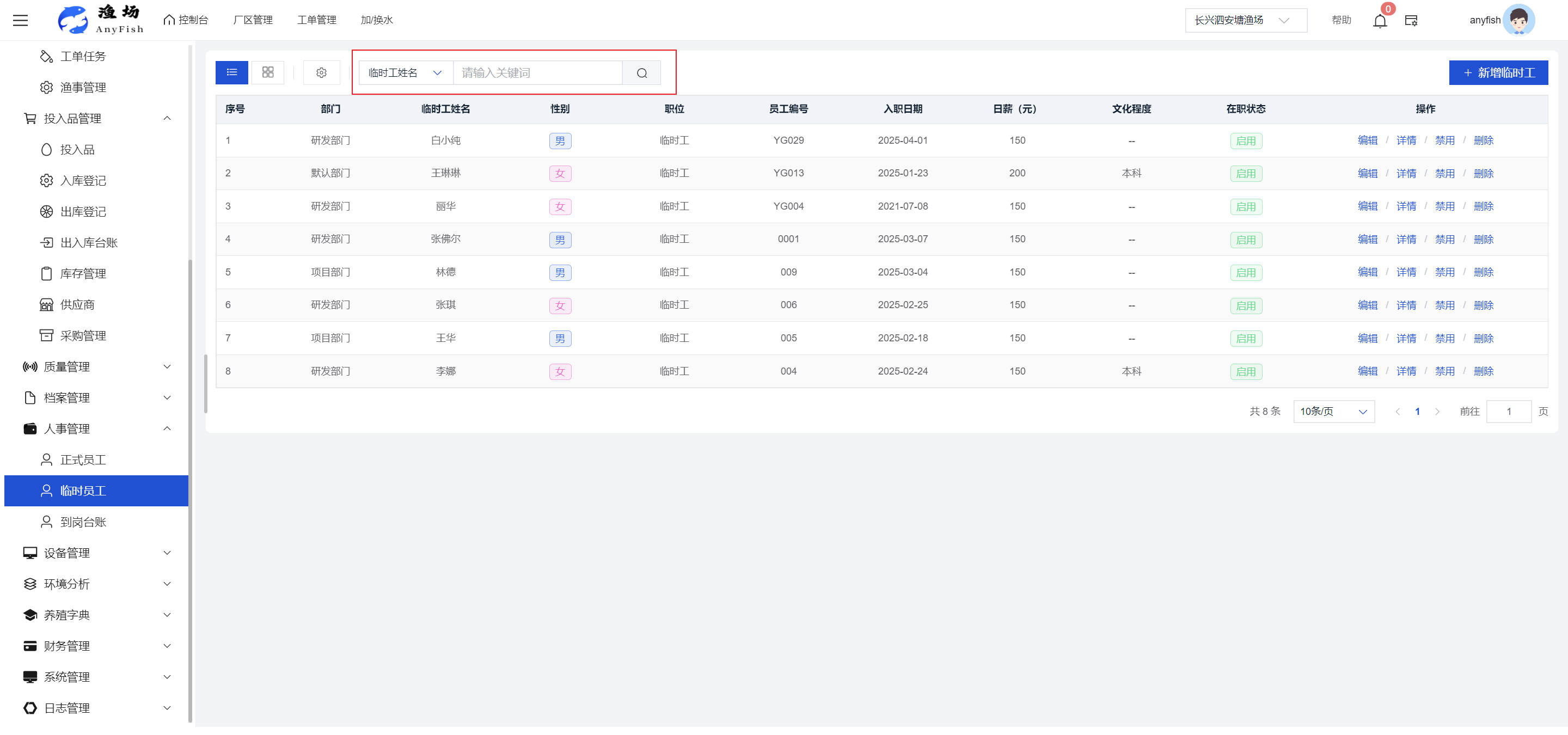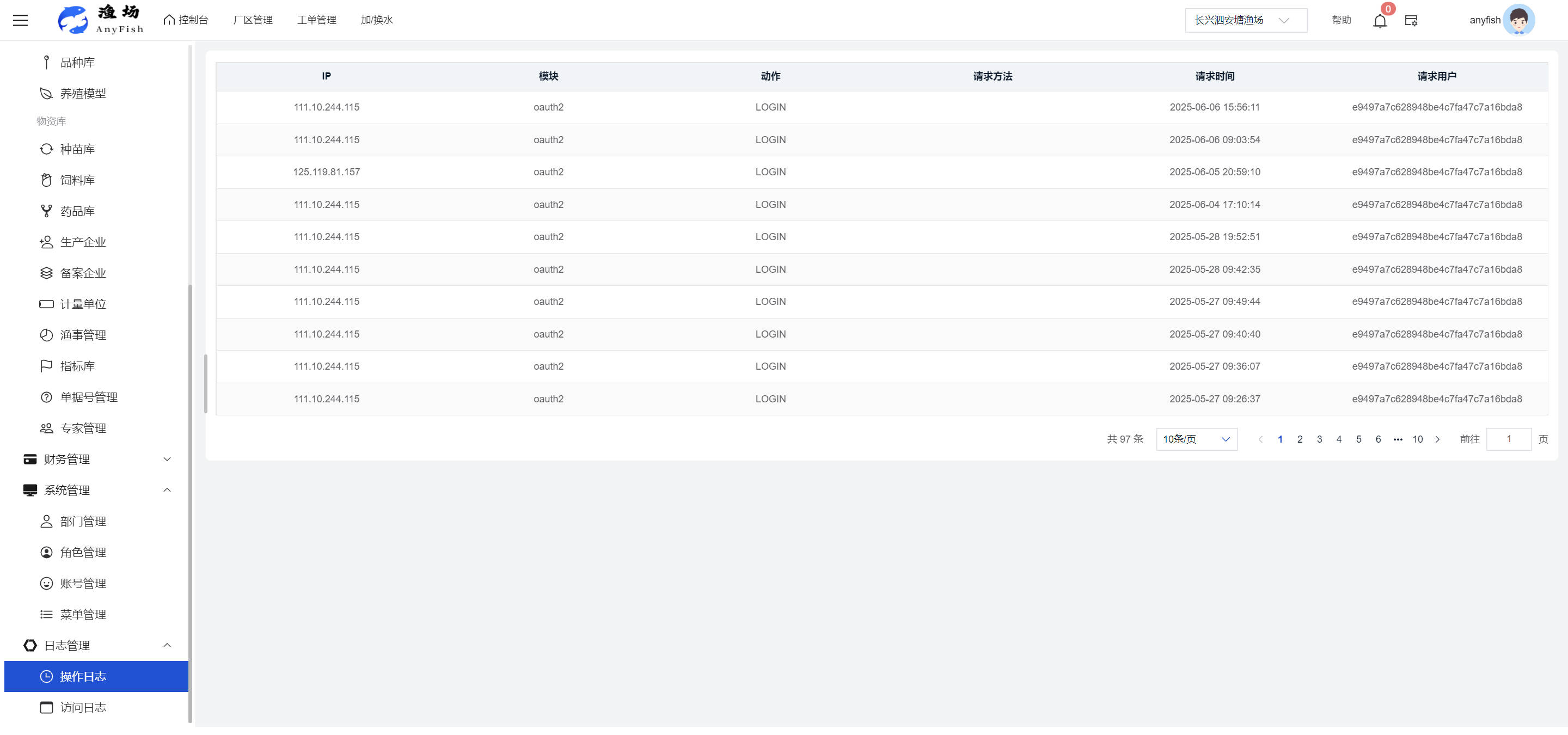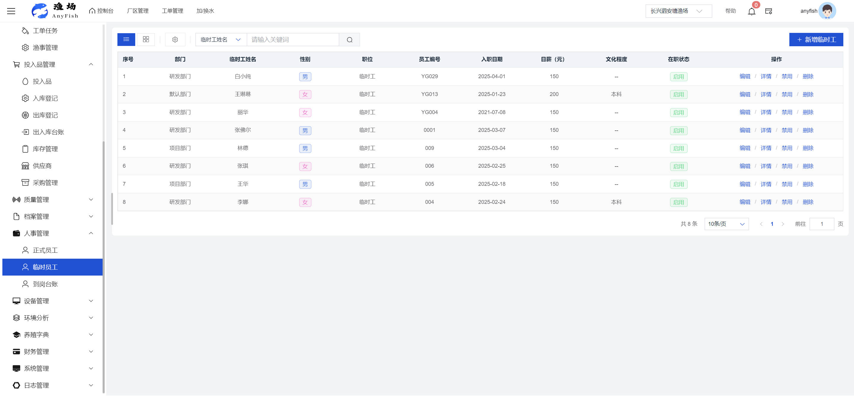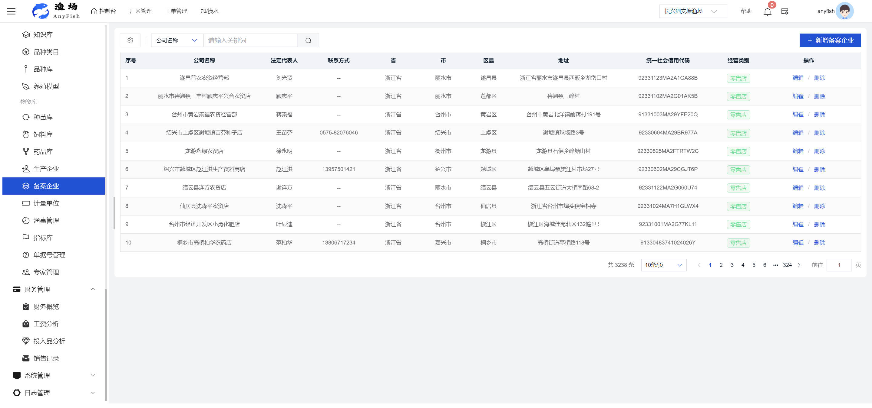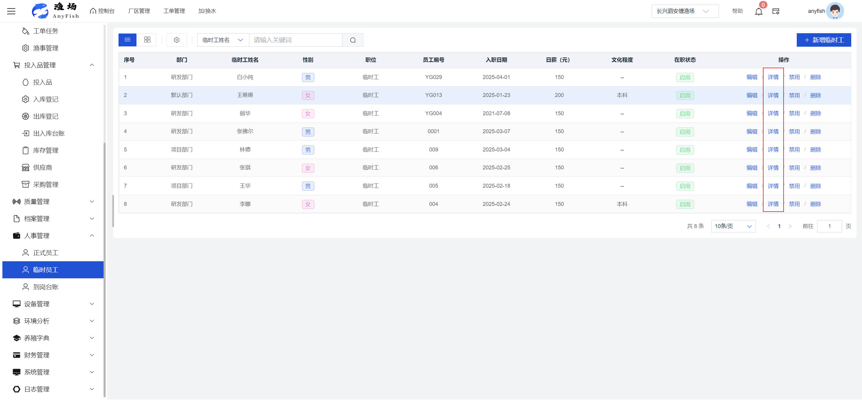 一、操作指南 1.1渔场概况 界面功能概述: 该界面作为渔场的首页及控制台界面,为用户呈现了渔场的整体概况信息。在这里,用户能够清晰地查看到渔场的数量、各个厂区的数量、当前在职的员工人数、实时的天气状况、已安装的摄像头设备数量以及是否存在离线设备等重要信息。同时,该界面还为用户提供了便捷的操作入口,例如可以进行渔场的管理操作以及新增员工等常用功能,方便用户对渔场的基本信息进行快速的了解和管理。  4.1.1.1 渔场概况 界面功能概述: 用户可以点击标红的地方跳转到渔场管理跳转到渔场管理界面。  用户点击界面中标红的区域即可跳转到渔场管理界面。在该界面中,用户可以全面了解渔场的各项详细信息,如渔场的占地面积、具体的养殖区域划分、在职员工的数量及基本信息、各类设备的运行情况、今日和明日的农事安排等。这些信息的展示有助于用户对渔场的整体运营状况有一个清晰的认识,同时也为后续的管理决策提供了有力的数据支持。此外,用户还可以在该界面进行一些基础的管理操作,如编辑渔场的基本信息、调整设备的设置等,以确保渔场的各项工作能够顺利进行。  4.1.1.2 渔场渔事 界面功能概述: 用户可以通过点击界面中标红的区域进入不同的渔事管理模块,例如培肥、投饵、收捕等常见的农事活动。  4.1.1.3 新增用户 界面元素功能概述: 该界面主要用于用户进行新增用户以及添加用户权限的操作。在渔场的日常运营中,可能需要不断添加新的员工或管理人员,并为他们分配相应的权限,以便他们能够顺利地完成各自的工作任务。通过该界面,用户可以方便地完成这些操作,确保渔场的人力资源管理更加高效和有序。  左侧搜索栏 :此搜索栏为用户提供了一个便捷的方式,允许用户在输入框内输入关键字,例如部门名称的关键词,从而快速搜索到特定的部门。这对于拥有多个部门的大型渔场来说,能够大大提高用户查找部门的效率,节省时间。 顶部搜索栏:在这里,用户可以在输入框内填写用户名称或关键词,以便快速搜索到特定的用户。当渔场员工数量较多时,通过关键词搜索能够迅速定位到目标用户,进而对其信息进行相应的操作,如查看、编辑或删除等。  新增用户按钮:点击该按钮后,系统会弹出一个新增用户的表单界面。  用户需要在该表单中填写完整的信息,包括但不限于用户名、密码、姓名、联系方式、所属部门、角色权限等。填写完成后,点击保存按钮,即可将新的用户成功添加到系统当中,使其能够登录并使用系统进行相关的工作操作。  编辑用户按钮:当用户需要修改员工的信息时,可以点击该按钮。  系统会跳转到员工信息编辑界面,在这里,用户可以对员工的基本信息、联系方式、角色权限等进行修改。修改完成后,点击保存按钮,即可使修改后的信息生效,确保员工的信息始终保持准确和更新。  删除按钮:如果需要删除某个员工账号,用户可以点击该删除按钮。系统会弹出一个确认对话框,提示用户是否确定要删除该员工。如果用户点击“是”,则系统将彻底删除该员工账号及其相关信息;如果用户点击“否”,则取消删除操作,员工账号保持不变。在删除员工账号时,用户需要谨慎操作,以免误删重要信息。  修改密码按钮:为了保障系统的安全性,用户可以通过点击该按钮来修改员工的密码。  在修改密码的界面中,用户需要输入新的密码并确认,然后点击保存按钮,即可完成密码的修改。修改后的密码将立即生效,员工需要使用新密码进行登录。这一功能在员工忘记密码或需要定期更新密码的情况下非常实用。  4.1.1.4 告警信息 界面功能概述: 该界面是一个渔场概况列表,主要展示渔场的基本情况以及各类告警信息。用户可以通过该界面查看渔场的详细信息,如渔场名称、位置、占地面积、当前的渔事活动等。  同时,系统会将各类告警信息以醒目的方式展示出来,包括设备故障告警、环境异常告警(如温度过高、湿度过低等)、渔事任务超时告警等。用户可以点击相应的告警信息,查看更多详细的告警内容,如告警发生的时间、具体的设备或区域、告警的严重程度等。此外,用户还可以在该界面进行一些相关的操作,如确认告警信息、查看告警处理进度、设置告警提醒方式等,以便及时处理各类问题,确保渔场的正常运营。  4.2渔场管理 4.2.1.渔场管理 摄像头管理 :用户可以在该界面中对摄像头进行添加、删除、调整位置等操作。通过合理配置摄像头,用户可以实现对渔场各个区域的实时监控,便于及时发现异常情况,保障渔场的安全。  4.2.2 厂区管理 界面功能概述 该界面是一个池塘列表,主要用于查看池塘的详细信息,包括池塘的占地面积、养殖模型、养殖面积、生长周期等。用户可以通过该界面全面了解各个池塘的基本情况,为养殖规划和渔事安排提供重要依据。同时,该界面还为用户提供了多种操作功能,如池塘管理操作、查看池塘详细信息等,方便用户对地块进行有效的管理和维护。  4.2.2.1 池塘管理:  添加旁边的搜索框(与添加按钮分开) :该搜索框允许用户输入关键词,如池塘名称、投入品名称或相关信息,进行快速搜索。通过输入关键词,系统将自动筛选出符合条件的池塘信息,方便用户在众多地块中快速找到目标池塘,提高工作效率。 添加按钮 :用户可以在右侧输入要添加的池塘信息,