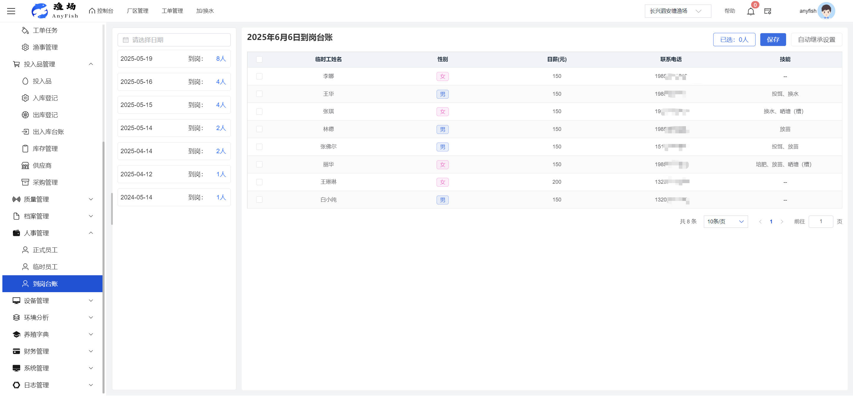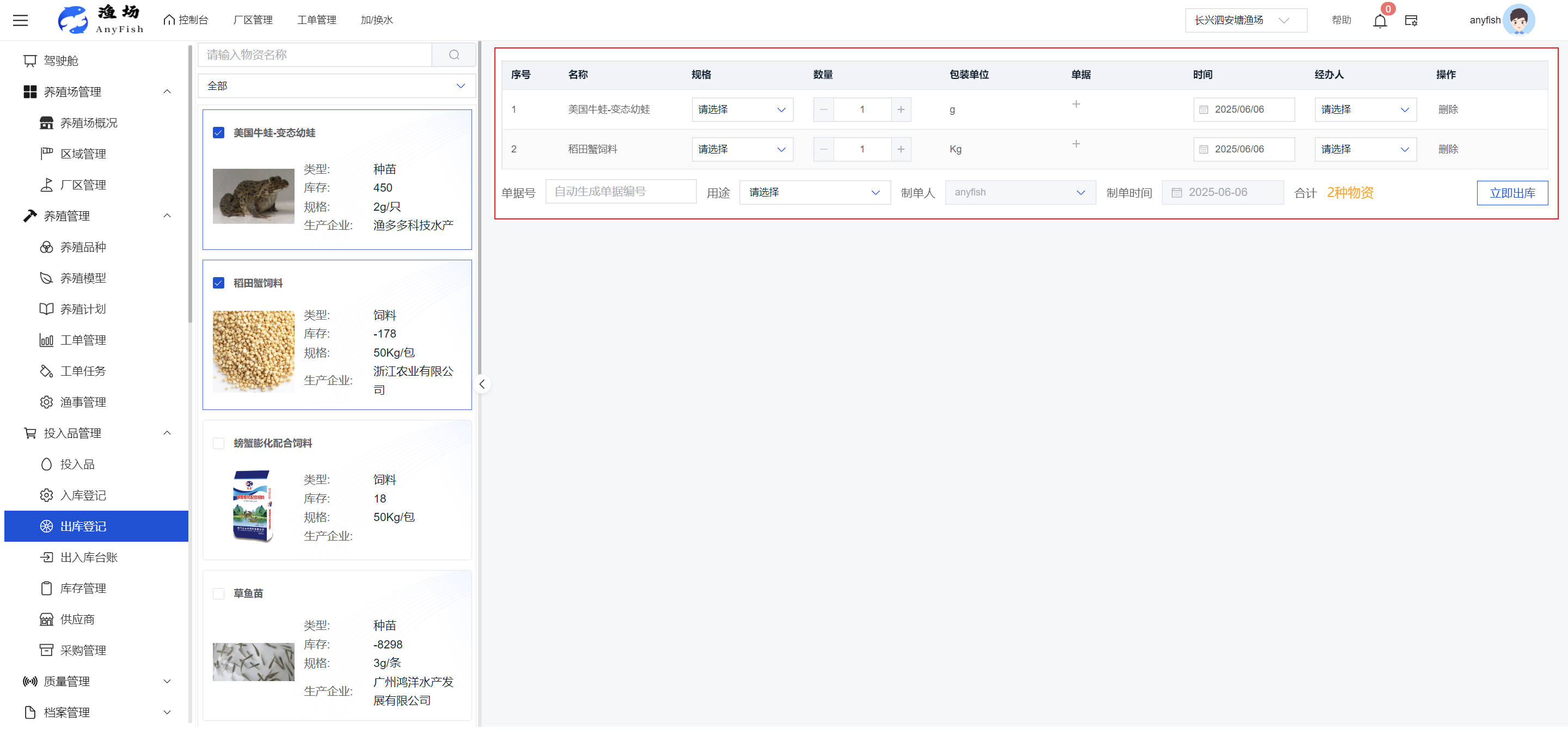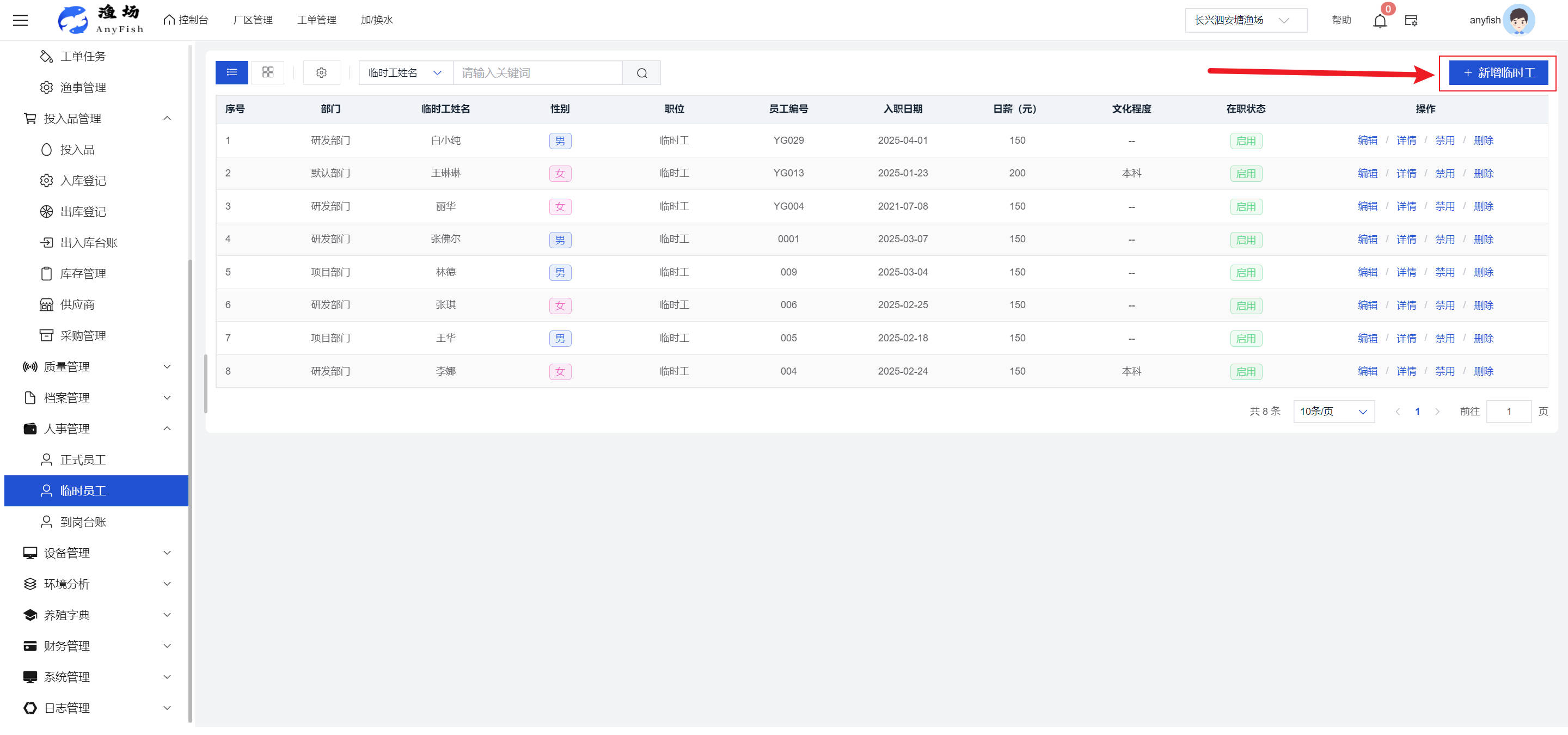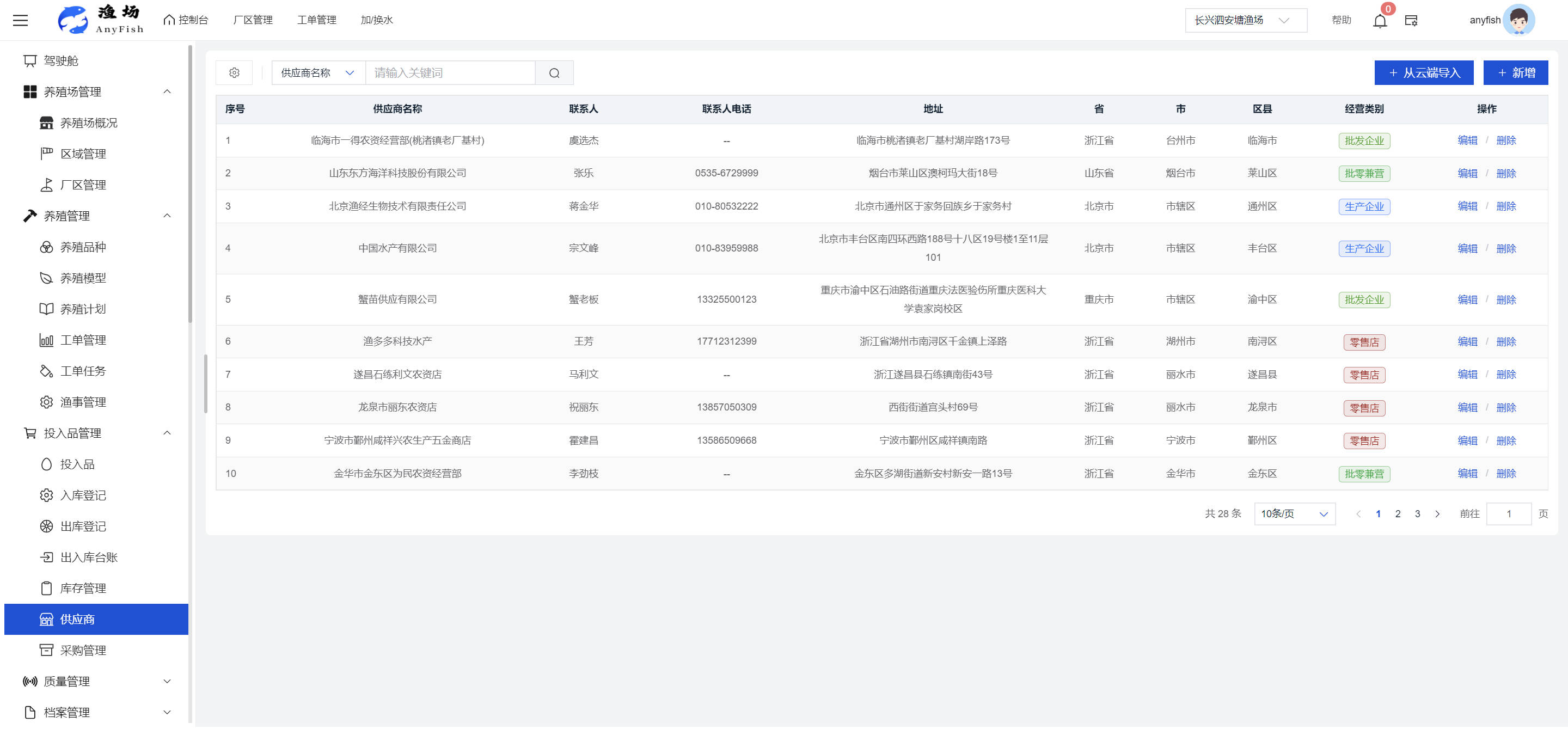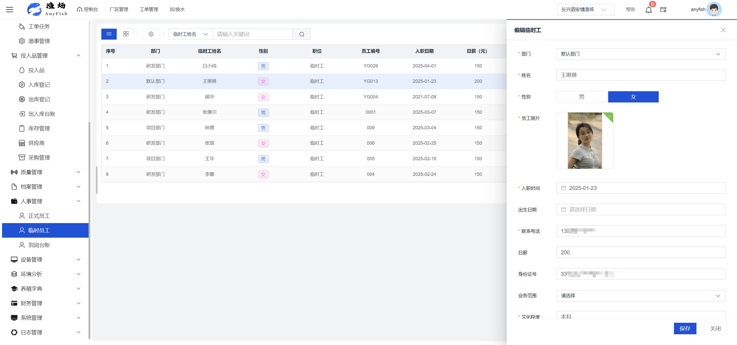 一、操作指南 1.1渔场概况 界面功能概述: 该界面作为渔场的首页及控制台界面,为用户呈现了渔场的整体概况信息。在这里,用户能够清晰地查看到渔场的数量、各个厂区的数量、当前在职的员工人数、实时的天气状况、已安装的摄像头设备数量以及是否存在离线设备等重要信息。同时,该界面还为用户提供了便捷的操作入口,例如可以进行渔场的管理操作以及新增员工等常用功能,方便用户对渔场的基本信息进行快速的了解和管理。  4.1.1.1 渔场概况 界面功能概述: 用户可以点击标红的地方跳转到渔场管理跳转到渔场管理界面。  用户点击界面中标红的区域即可跳转到渔场管理界面。在该界面中,用户可以全面了解渔场的各项详细信息,如渔场的占地面积、具体的养殖区域划分、在职员工的数量及基本信息、各类设备的运行情况、今日和明日的农事安排等。这些信息的展示有助于用户对渔场的整体运营状况有一个清晰的认识,同时也为后续的管理决策提供了有力的数据支持。此外,用户还可以在该界面进行一些基础的管理操作,如编辑渔场的基本信息、调整设备的设置等,以确保渔场的各项工作能够顺利进行。  4.1.1.2 渔场渔事 界面功能概述: 用户可以通过点击界面中标红的区域进入不同的渔事管理模块,例如培肥、投饵、收捕等常见的农事活动。  4.1.1.3 新增用户 界面元素功能概述: 该界面主要用于用户进行新增用户以及添加用户权限的操作。在渔场的日常运营中,可能需要不断添加新的员工或管理人员,并为他们分配相应的权限,以便他们能够顺利地完成各自的工作任务。通过该界面,用户可以方便地完成这些操作,确保渔场的人力资源管理更加高效和有序。  左侧搜索栏 :此搜索栏为用户提供了一个便捷的方式,允许用户在输入框内输入关键字,例如部门名称的关键词,从而快速搜索到特定的部门。这对于拥有多个部门的大型渔场来说,能够大大提高用户查找部门的效率,节省时间。 顶部搜索栏:在这里,用户可以在输入框内填写用户名称或关键词,以便快速搜索到特定的用户。当渔场员工数量较多时,通过关键词搜索能够迅速定位到目标用户,进而对其信息进行相应的操作,如查看、编辑或删除等。  新增用户按钮:点击该按钮后,系统会弹出一个新增用户的表单界面。  用户需要在该表单中填写完整的信息,包括但不限于用户名、密码、姓名、联系方式、所属部门、角色权限等。填写完成后,点击保存按钮,即可将新的用户成功添加到系统当中,使其能够登录并使用系统进行相关的工作操作。  编辑用户按钮:当用户需要修改员工的信息时,可以点击该按钮。  系统会跳转到员工信息编辑界面,在这里,用户可以对员工的基本信息、联系方式、角色权限等进行修改。修改完成后,点击保存按钮,即可使修改后的信息生效,确保员工的信息始终保持准确和更新。  删除按钮:如果需要删除某个员工账号,用户可以点击该删除按钮。系统会弹出一个确认对话框,提示用户是否确定要删除该员工。如果用户点击“是”,则系统将彻底删除该员工账号及其相关信息;如果用户点击“否”,则取消删除操作,员工账号保持不变。在删除员工账号时,用户需要谨慎操作,以免误删重要信息。  修改密码按钮:为了保障系统的安全性,用户可以通过点击该按钮来修改员工的密码。  在修改密码的界面中,用户需要输入新的密码并确认,然后点击保存按钮,即可完成密码的修改。修改后的密码将立即生效,员工需要使用新密码进行登录。这一功能在员工忘记密码或需要定期更新密码的情况下非常实用。  4.1.1.4 告警信息 界面功能概述: 该界面是一个渔场概况列表,主要展示渔场的基本情况以及各类告警信息。用户可以通过该界面查看渔场的详细信息,如渔场名称、位置、占地面积、当前的渔事活动等。  同时,系统会将各类告警信息以醒目的方式展示出来,包括设备故障告警、环境异常告警(如温度过高、湿度过低等)、渔事任务超时告警等。用户可以点击相应的告警信息,查看更多详细的告警内容,如告警发生的时间、具体的设备或区域、告警的严重程度等。此外,用户还可以在该界面进行一些相关的操作,如确认告警信息、查看告警处理进度、设置告警提醒方式等,以便及时处理各类问题,确保渔场的正常运营。  4.2渔场管理 4.2.1.渔场管理 摄像头管理 :用户可以在该界面中对摄像头进行添加、删除、调整位置等操作。通过合理配置摄像头,用户可以实现对渔场各个区域的实时监控,便于及时发现异常情况,保障渔场的安全。  4.2.2 厂区管理 界面功能概述 该界面是一个池塘列表,主要用于查看池塘的详细信息,包括池塘的占地面积、养殖模型、养殖面积、生长周期等。用户可以通过该界面全面了解各个池塘的基本情况,为养殖规划和渔事安排提供重要依据。同时,该界面还为用户提供了多种操作功能,如池塘管理操作、查看池塘详细信息等,方便用户对地块进行有效的管理和维护。  4.2.2.1 池塘管理:  添加旁边的搜索框(与添加按钮分开) :该搜索框允许用户输入关键词,如池塘名称、投入品名称或相关信息,进行快速搜索。通过输入关键词,系统将自动筛选出符合条件的池塘信息,方便用户在众多地块中快速找到目标池塘,提高工作效率。 添加按钮 :用户可以在右侧输入要添加的池塘信息,